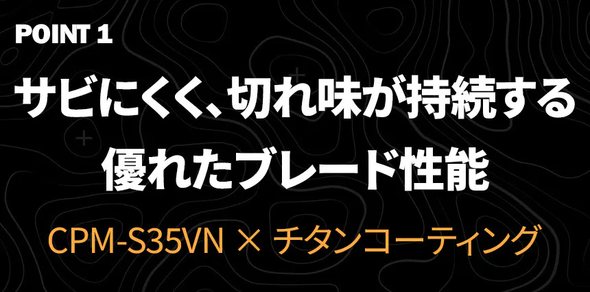 A:「耐食性」と「質感」を向上させるためです。 S35VN鋼材自体もサビに強いですが、チタンコーティングを施すことで、さらなる耐食性を付与しています。また、光の反射を抑えた深いマットな質感を与えることで、タクティカルな機能美を演出しています。