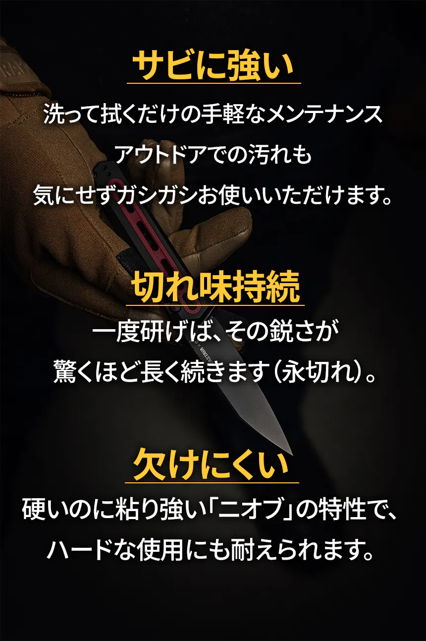 名作S30Vをベースに、特殊成分「ニオブ」を配合することで誕生したプレミアムステンレス鋼。 その最大の特徴は、「圧倒的な耐食性」と「強靭な粘り」の両立です。 クロム含有量14%という数値は、一般的なステンレス鋼を凌駕し、水濡れや湿気に対する驚くべき抵抗力を発揮します。