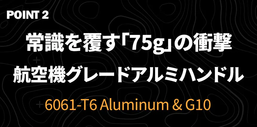 全長196mmという迫力あるサイズ感でありながら、手に取った瞬間、その軽さに驚くはずです。 F4 ECHOのハンドルには、航空機の構造材としても使用される高強度アルミニウム合金「6061-T6」を採用。 鉄のような強靭さを持ちながら、卵1個分(約60g)と変わらない、驚異的な軽量化を実現しました。