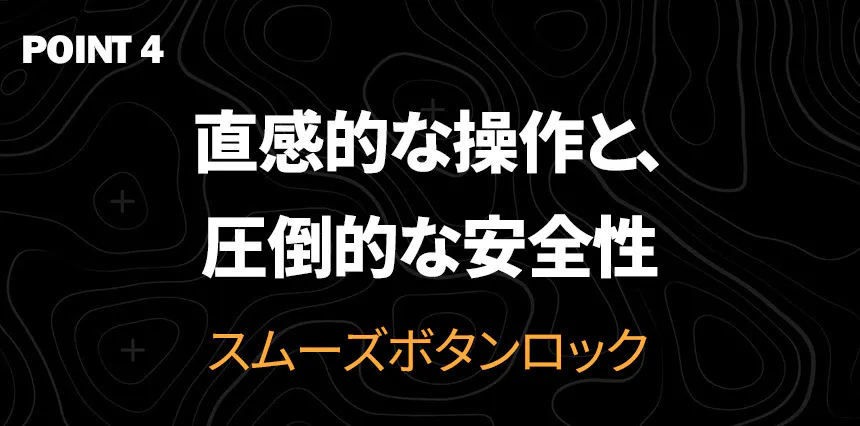 A:安全かつ迅速にブレードを固定・解除するロック機構です。 ハンドルのボタンを押すことでロックが解除され、ブレードを収納できます。一般的なライナーロックと異なり、指を刃の通り道に置かずに収納できるため、非常に安全性が高いのが特徴です。また、ロック強度が強く、過酷な使用にも耐えうる構造です。