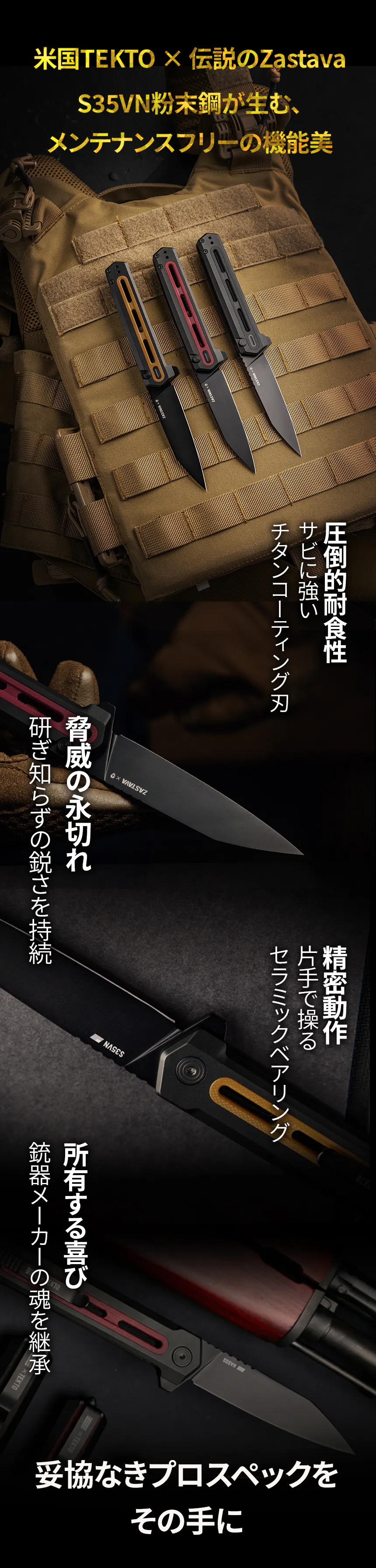 東欧の伝説Zastava Arms USAと米国TEKTOが奇跡のコラボ。高級粉末鋼CPM-S35VNにチタンコーティングを施し、驚異の耐食性を実現。全長196mmでわずか75gの航空機グレードアルミボディ。セラミックベアリングによる0.1秒展開。メンテナンスフリーのフォールディングナイフが日本上陸