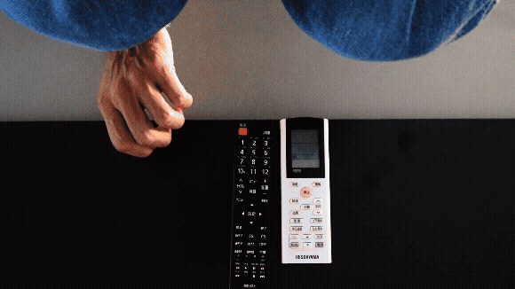 テーブルの下に設置したリモコンを手探りでとっている様子