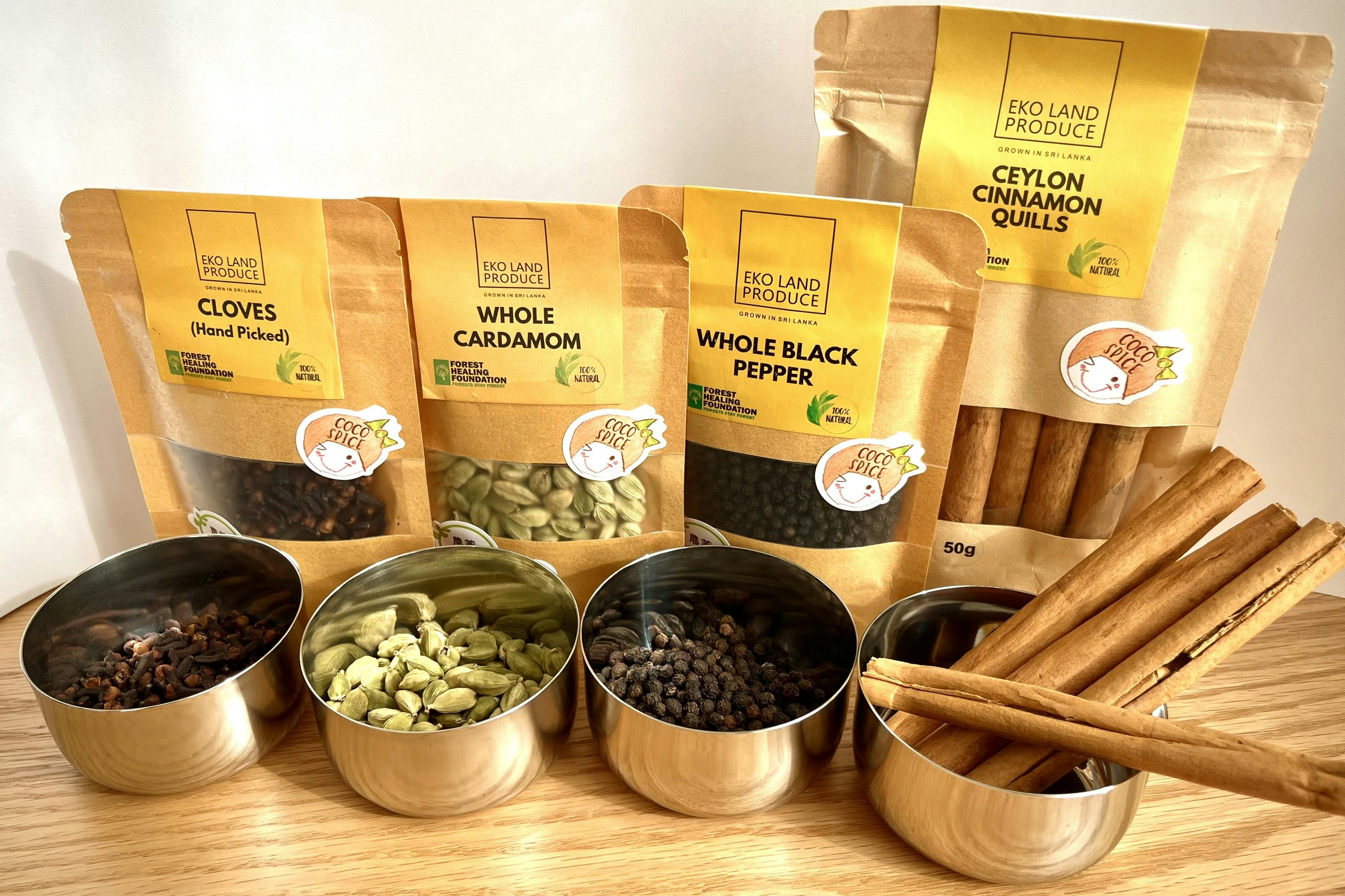 彼らを管理するEKO LAND PRODUCEは、2020年COVIDパンデミックでスリランカのエコツーリズムが制限される中、地域社会に新たな雇用機会を創出するために設立されました。サプライチェーンの短縮により、スパイスに適正な価格を設定することでコミュニティを経済的に支援しています。
