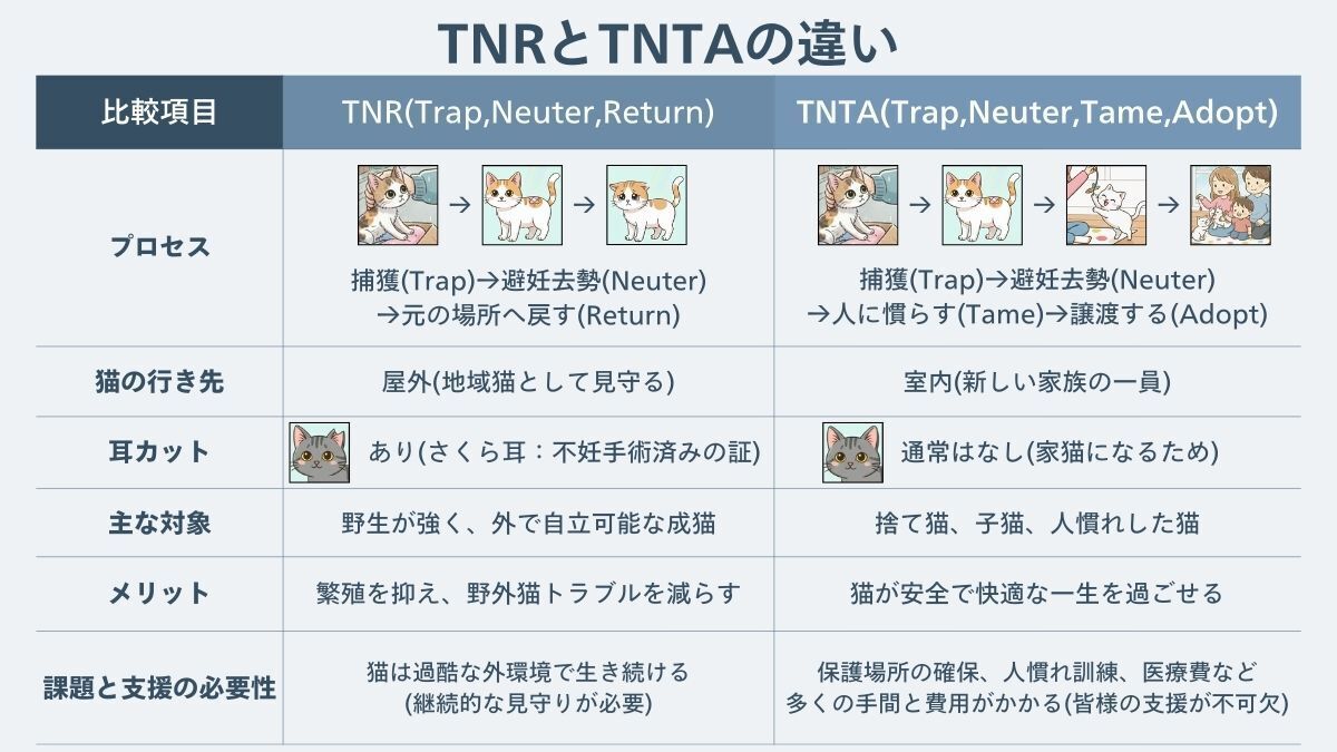 保護猫活動に詳しい方であればご存じかもしれませんが、私たちはこのT・Aの部分を担うため一頭でも多くの猫さんたちが安心して暮らせる「シェルター」をつくる必要をひしひしと感じています。保護活動における TNTA と TNR の主な違いは、手術を終えた後の猫が「家に入る」か「外に戻す」点にあります。