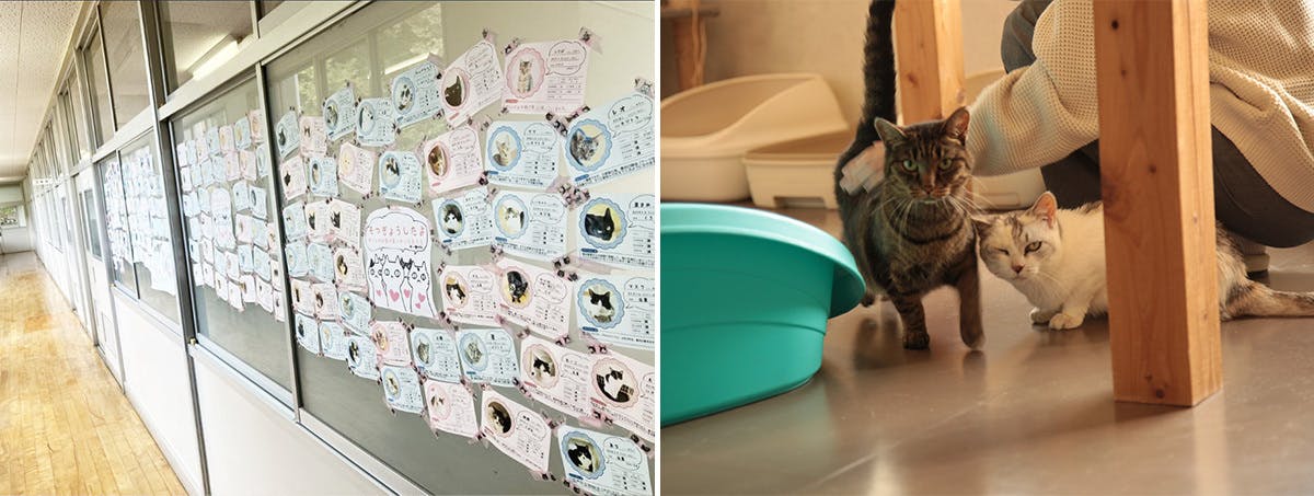 廊下にはこれまで卒業した猫たちの紹介が。在校生の猫たちとも近い距離で触れ合えます!