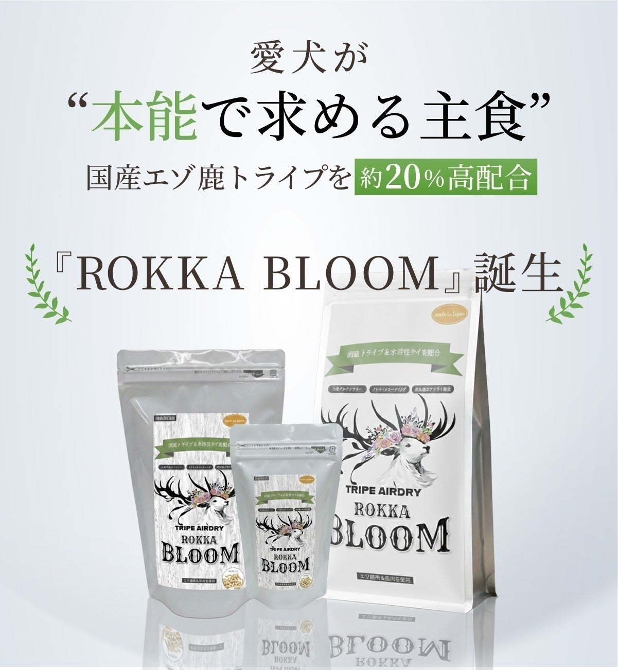 ROKKA BLOOMは、検査済みの国産エゾ鹿トライプを約20%高配合し、非加熱・ノンオイルコーティング