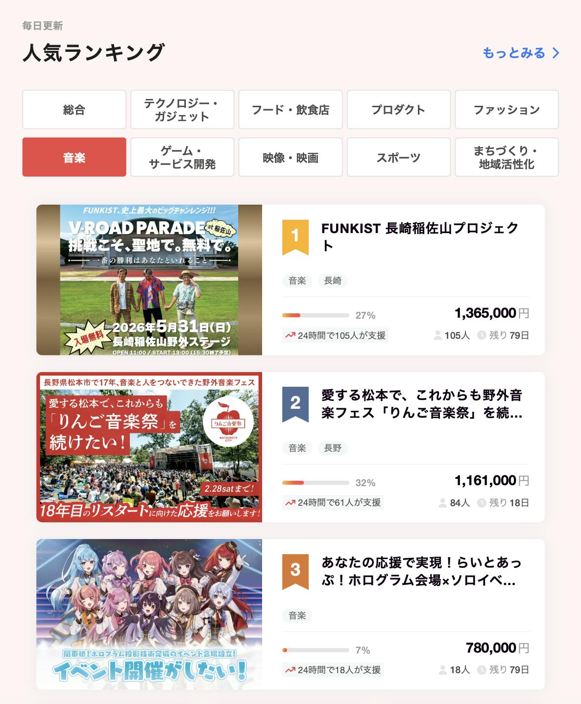 2026/02/10 22:01いよいよ本日より、FUNKIST 稲佐山に向けたクラウドファンディングがスタートしました。そして何より――早速ご支援くださった皆さま、本当に、本当にありがとうございます。本当はまず、このプロジェクトに込めた想いや背景を、丁寧にお伝えするところから始めようと思っていました。ですが、その前にどうしても共有したい出来事があり、こうしてご連絡しています。皆さまのご支援のおかげで、本プロジェクトは CAMPFIRE 音楽部門ランキング1位 を獲得しました。さらに、音楽以外のすべてのカテゴリーを含めた 総合ランキングでも3位 という結果をいただいています。これは決して「ランキングを目指していた」からではありません。この挑戦に共感し、想いを託してくださった皆さまと同じ価値観、同じ熱量を共有できている証だと感じています。我々に さらに期待をもたせてくれるような、忘れられないスタートになりました。(私たちの CAMPFIREの担当スタッフ様も、数多くのクラファンを見させていただきましたが、ファンとの一体感含め、本当に素晴らしい!というお言葉をいただきました!)ご挨拶が遅れましたが、今回の FUNKIST 稲佐山プロジェクト(クラウドファンディング含む) のプロジェクトリーダーを務めさせていただいております、実行委員会メンバー・株式会社RITTAの 長江(ながえ) と申します。これから、こちらの活動報告を通して、準備の裏側、決断の瞬間、うまくいったことも、うまくいかなかったことも――できる限り正直に、さらけ出しながら皆さまと一緒にゴールへ向かって進んでいきたいと思っています。このプロジェクトは、「支援して終わり」ではなく、一緒に作り、一緒に見届け、一緒に誇れる挑戦にしたいと思ってます。最後まで、全力で走ります。どうかプロジェクト終了まで、共に歩んでください。これから、よろしくお願いいたします。プロジェクトスタッフ RITTA 長江 もっと見る