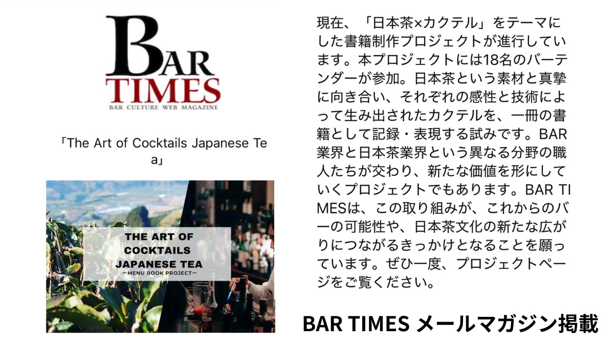 2026/03/09 18:00本プロジェクトをご覧いただいている皆さま、そして支援者の皆さまへ現在、達成率63%、79名の方にご支援をいただいております。改めて心より感謝申し上げます。この度、バー業界メディアにて本プロジェクトを再びご紹介いただきました。バー業界メディア「Drink Planet」にて本企画が再掲載。さらに本日、BAR TIMES様のメールマガジンでも本プロジェクトをご紹介いただいております。※以前の記事掲載に続き、内容を新たにしたメルマガとして再配信いただきました。日本茶とカクテル。異なる分野の職人たちが交わり、その表現を記録として残す試みです。こうして業界メディアに継続して取り上げていただけたことを大変ありがたく感じています。残り11日。達成率100%を目指して。この記録が一冊の本として形になるよう、最後まで丁寧に進めてまいります。 もっと見る