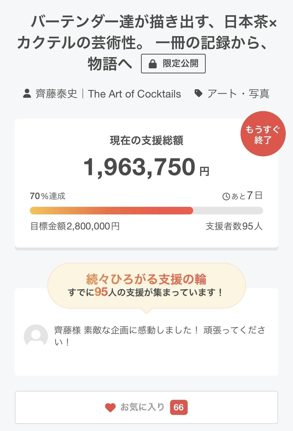2026/03/13 19:00本日、支援総額が 70%に到達しました。ここまで支えてくださった皆様、本当にありがとうございます。この企画はバーテンダー18名が日本茶と向き合い、その表現を「記録」として残す一冊を形にしようとする試みです。現在 1,963,750円 / 2,800,000円支援者 95名 ここまで多くの方の支えで進むことができています。クラウドファンディングは残り7日となりました。この挑戦が一冊の本として形になるまで、最後まで進んでいきます。引き続き見守っていただけましたら嬉しいです。 もっと見る