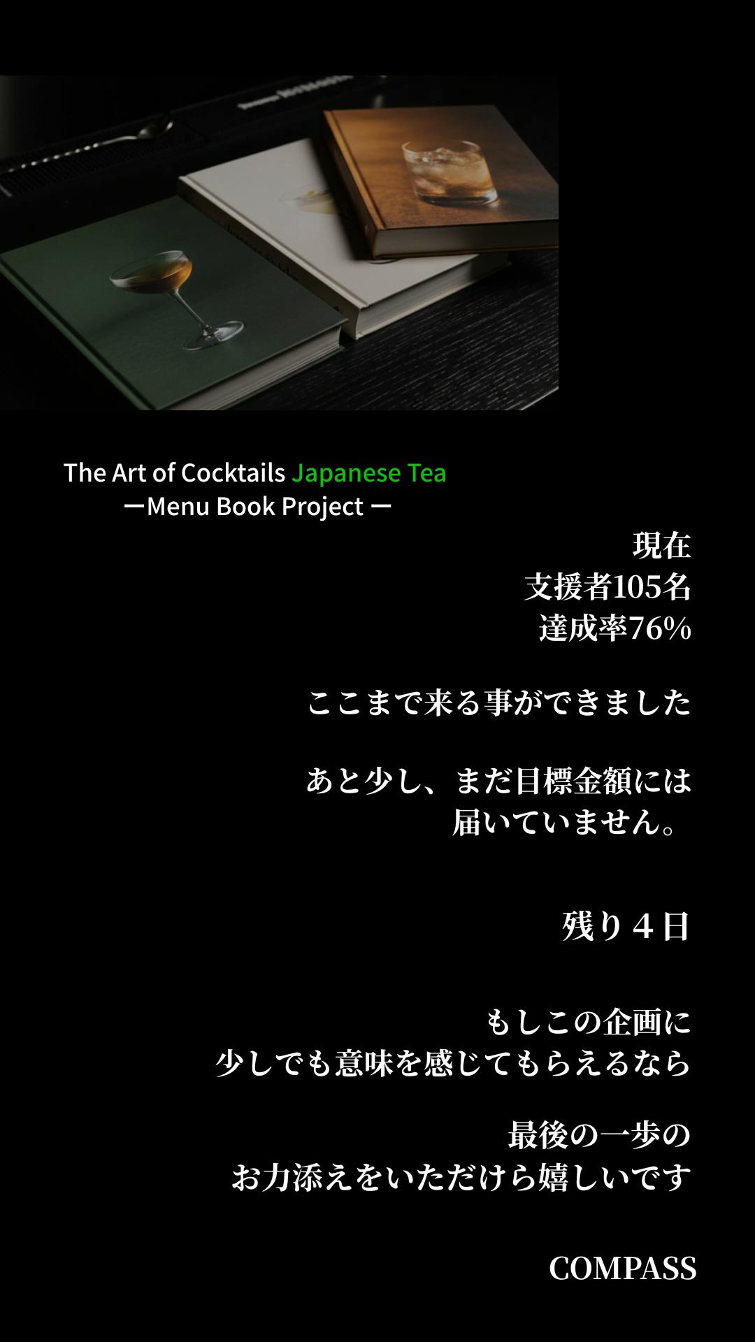 2026/03/16 21:00【進捗のご報告】3.16 20:00現在、109名の方にご支援いただき 達成率は78%となりました。ここまで多くの方に支えていただき、残り4日となりました。本当にありがとうございます。日本茶とカクテル。二つの文化が出会うこの取り組みを、一冊の記録として未来へ残そうとしています。この一冊は、私たちだけでなく、支えてくださる皆さまと共に綴られていく記録です。もし皆さまの周りにご興味を持っていただけそうな方がいらっしゃいましたら、このプロジェクトのことをお伝えいただけたら嬉しく思います。クラウドファンディングは3月20日23:59までです。最後までどうぞよろしくお願いいたします。COMPASS メンバー一同 もっと見る