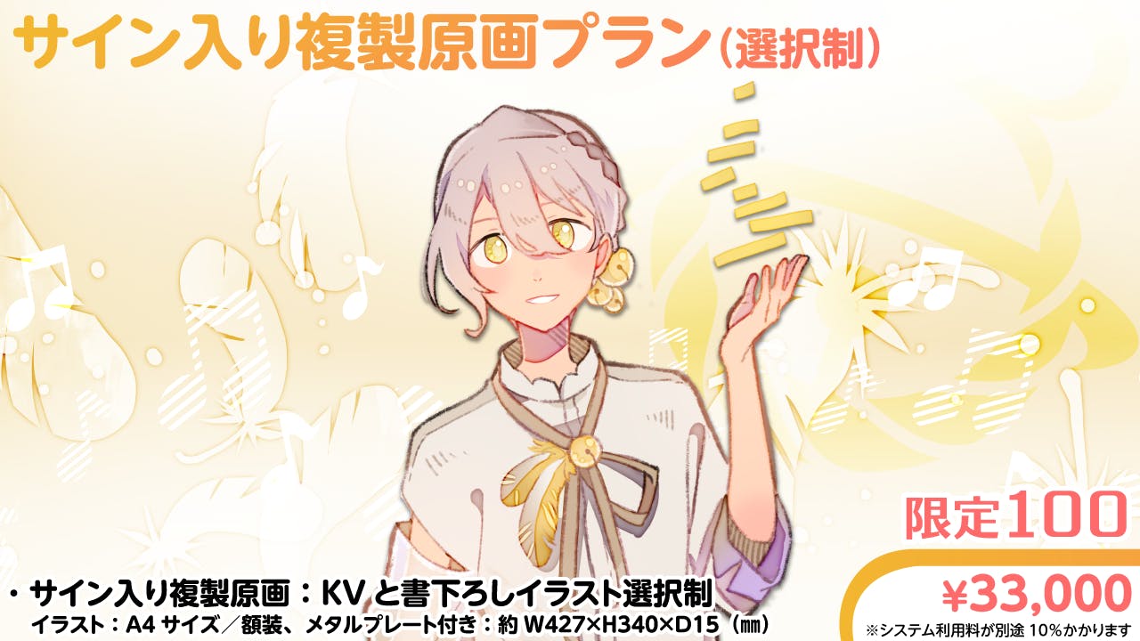 VOCALOID6 伊織弓鶴のキービジュアルまたは描き下ろしイラストを使用した、サイン入り複製原画をお届けするプランです。