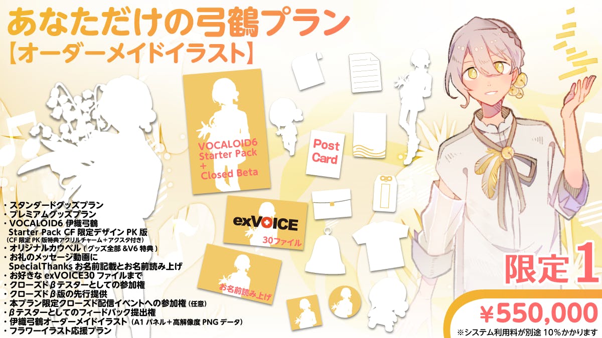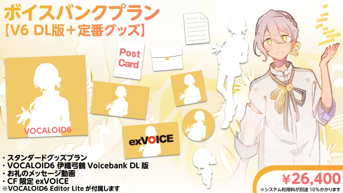 VOCALOID6 伊織弓鶴 Voicebank(DL版)を中心に楽しみたい方向けのプランです。制作への感謝を込めたお礼メッセージ動画と、クラウドファンディング限定exVOICEも付属。