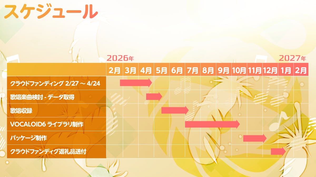 本プロジェクトはAll or Nothing方式での実施となるため、VOCALOID6 伊織弓鶴の音声収録や歌声データ制作などの本制作は、第一ゴール達成後に開始する予定です。