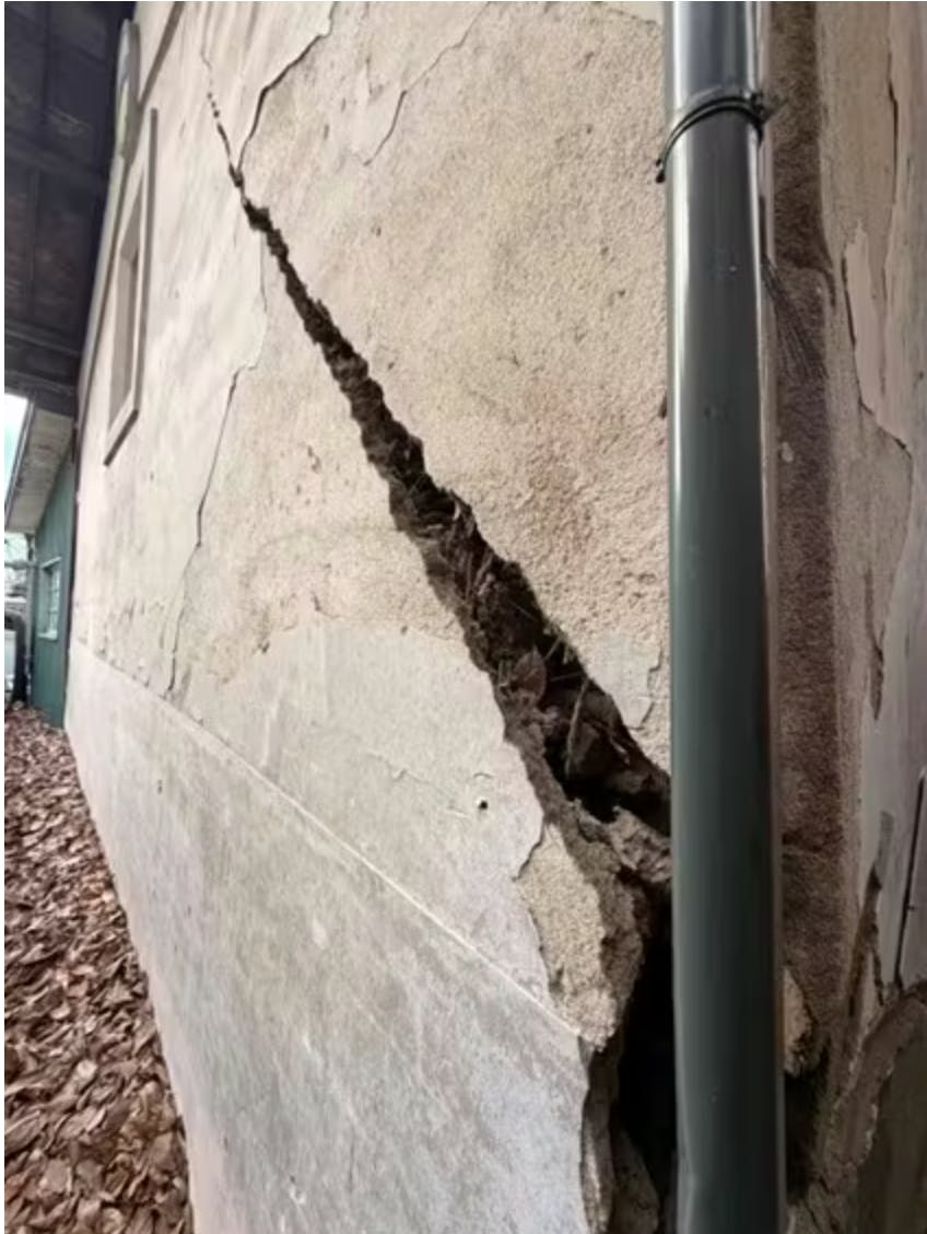 この土蔵の蔵の外壁に3メートル以上にわたり大きく割れてしまいました。土蔵の蔵の中に被害はありませんでしたし、安全の確認も全て行い、通常の蔵見学などは問題なく行えます。