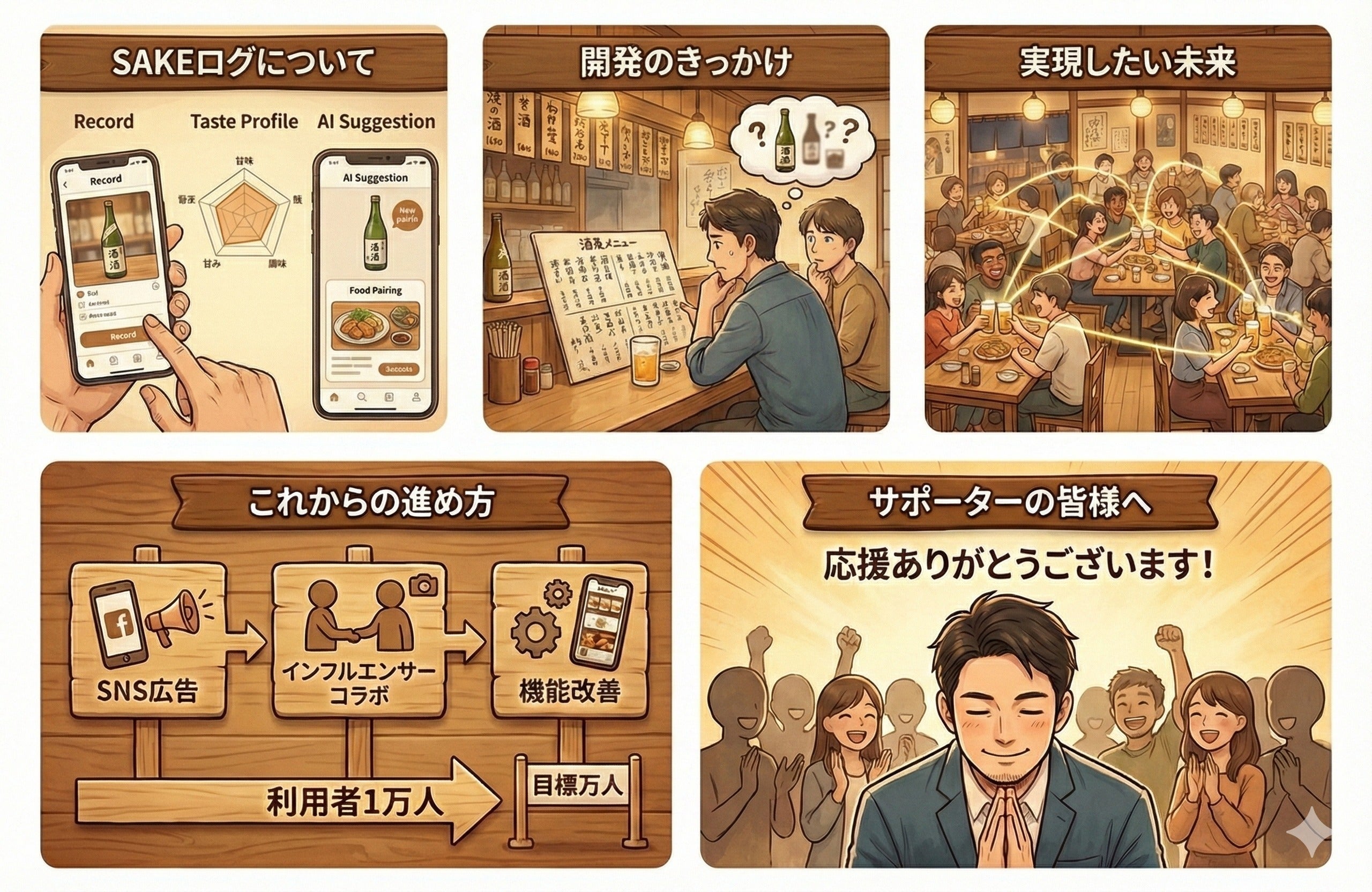 個人開発で機能は作れても、最大の壁は「共感してくれる利用者をどう増やすか」です。SAKEログは、ユーザーの記録が溜まるほど便利になるサービスなので、初期は特に利用者拡大の初速**が重要です。