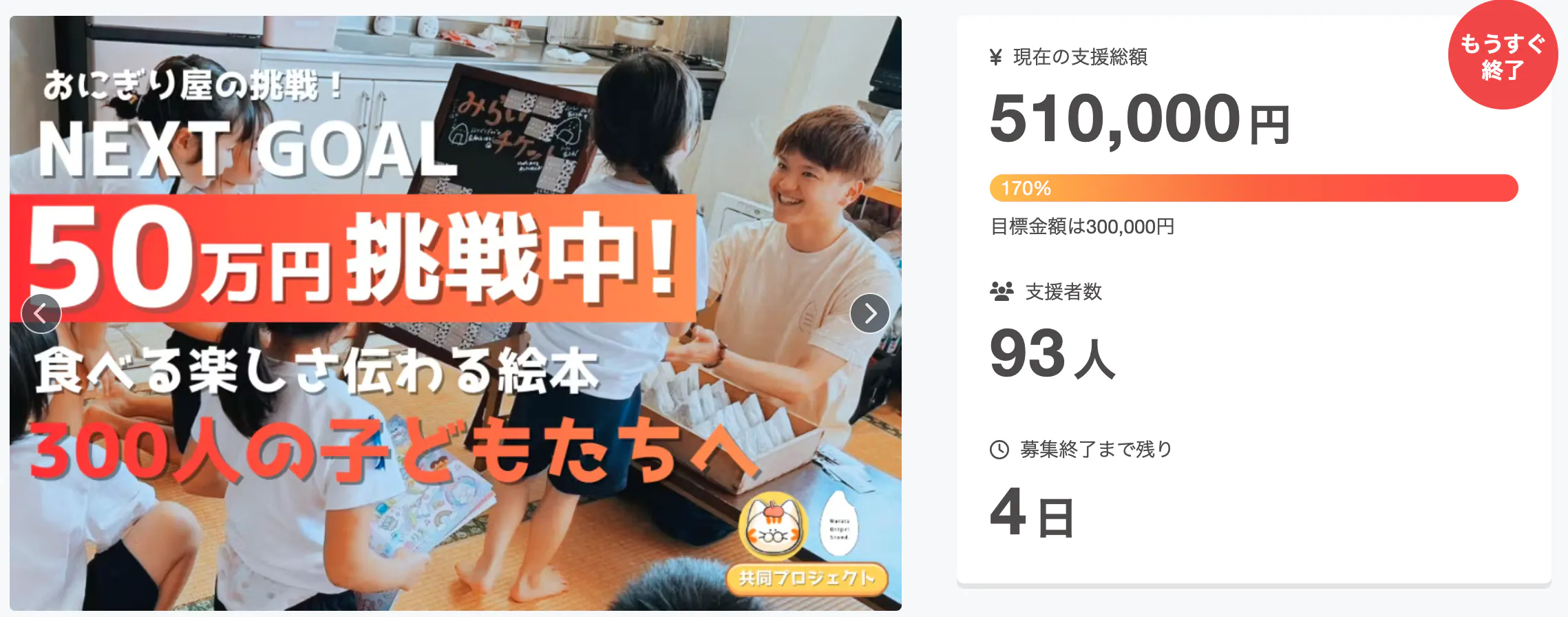 おかげさまで、ネクストゴールとして設定していた50万円を達成することができました。改めてお礼を言わせてください。皆さんほんとうにありがとうございます。約50日にわたって行ってきたクラウドファンディングも、残すところあと数日となりました。ここまで大きなプロジェクトになったのも、ご支援・拡散いただいた皆さんのおかげです。まさに大人みんなで作り上げる一冊という感じがして僕自身とても嬉しく感じています。今回クラウドファンディングという形をとってほんとうによかったです。ラストスパート!応援よろしくお願いします!さて、クラウドファンディング終了後にまた改めてお礼を言う場は設けさせていただきますが、残り数日ありますので、ぜひもう一押し皆さんのお力を貸していただけると有り難いです。活動のシェアをしていただけるだけで構いませんので、どうぞご協力ください。例えば、3,000円の支援で約4冊、10,000円の支援で約15冊の絵本を刷ることができる計算です。児童施設などを中心に送る予定なので、1冊増えるだけで、もっと多くの子どもたちがこの絵本を手にする機会が増えます。一緒に多くの子どもたちにこの素敵な絵本を届けましょう!引き続きどうぞよろしくお願いいたします。村田寛和