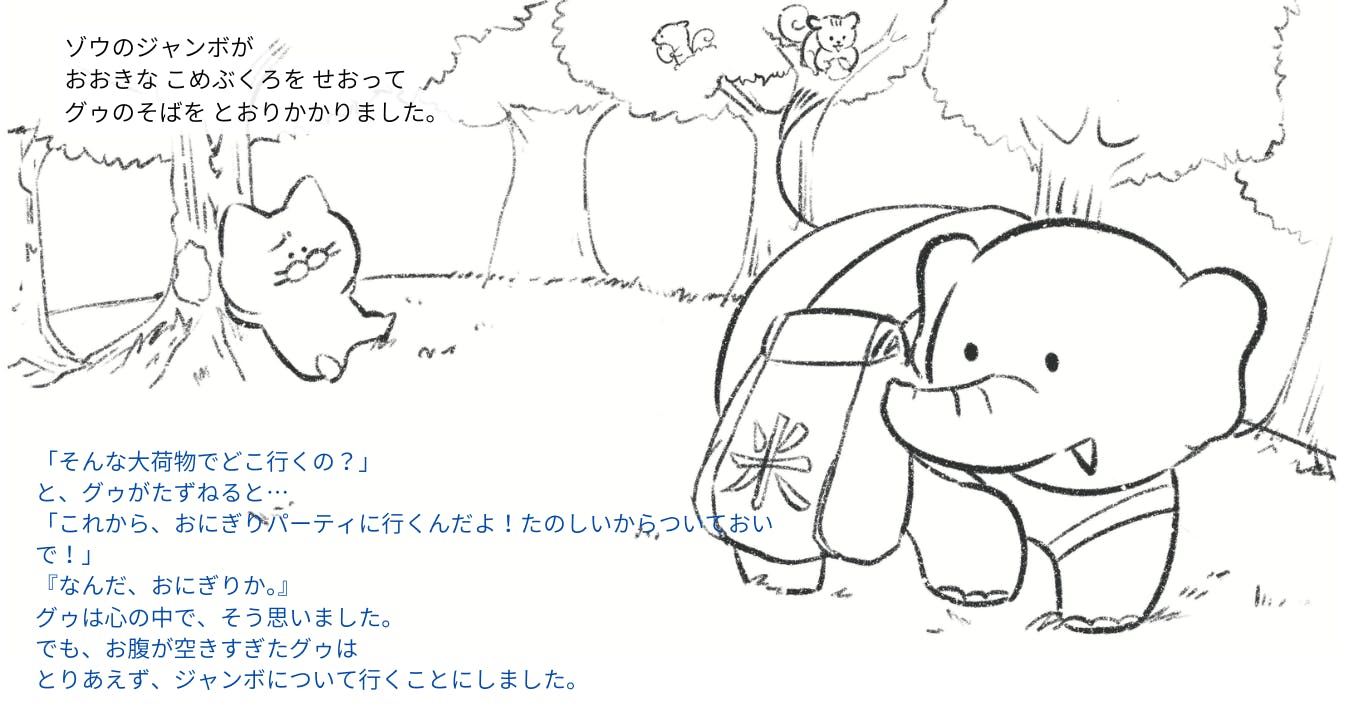 お腹を空かせたこねこの【グゥ】の登場から物語が始まります。