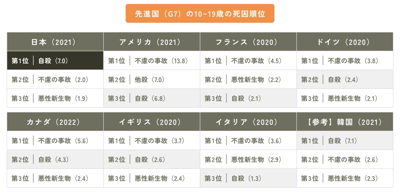 G7の中で、10〜19歳の死因の1位が自殺なのは日本だけです(厚労省・自殺対策白書)。