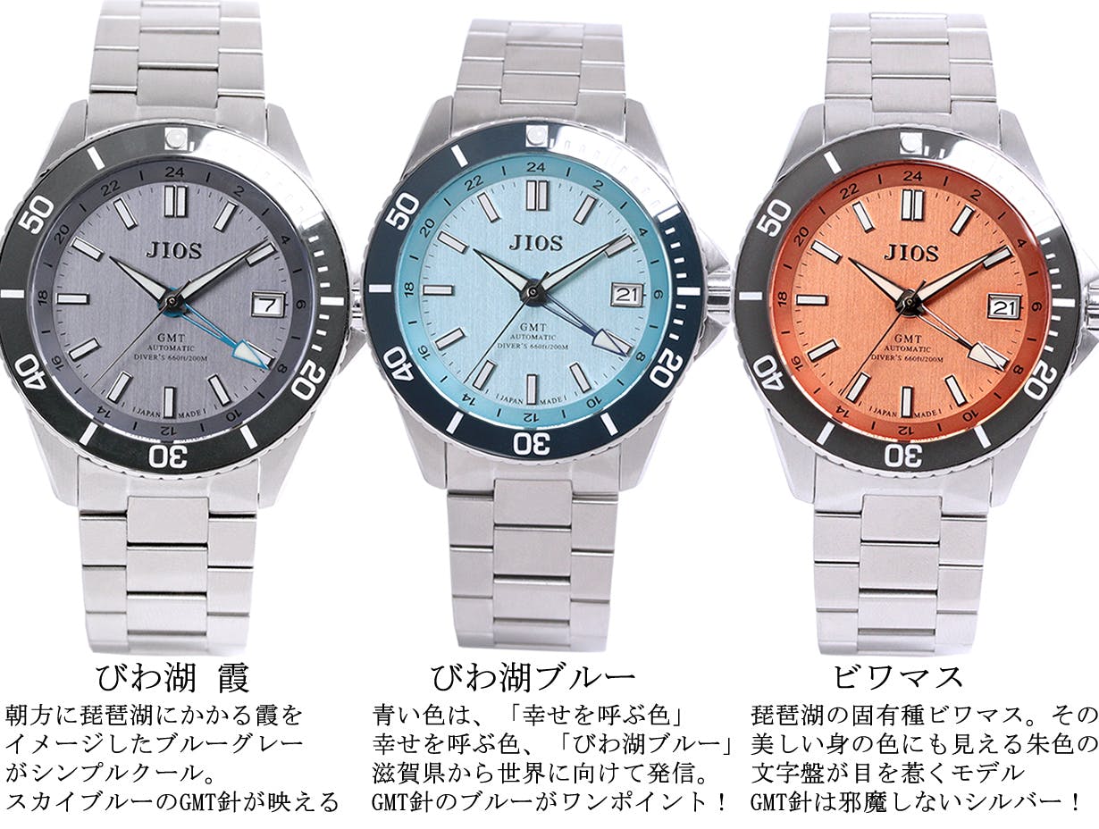 日本のモノづくりを世界へ発信する!日本製腕時計ブランドJIOS!世界へ発信する地元の名を冠したカラー!「びわ湖ブルー」と「ビワマス」と「びわ湖 霞」が登場!琵琶湖の最深部104Mまで潜れる200M防水性能と日本製の高品質自動巻きGMTを合わせたダイバーズウォッチ!さらに高いコストパフォーマンスを実現