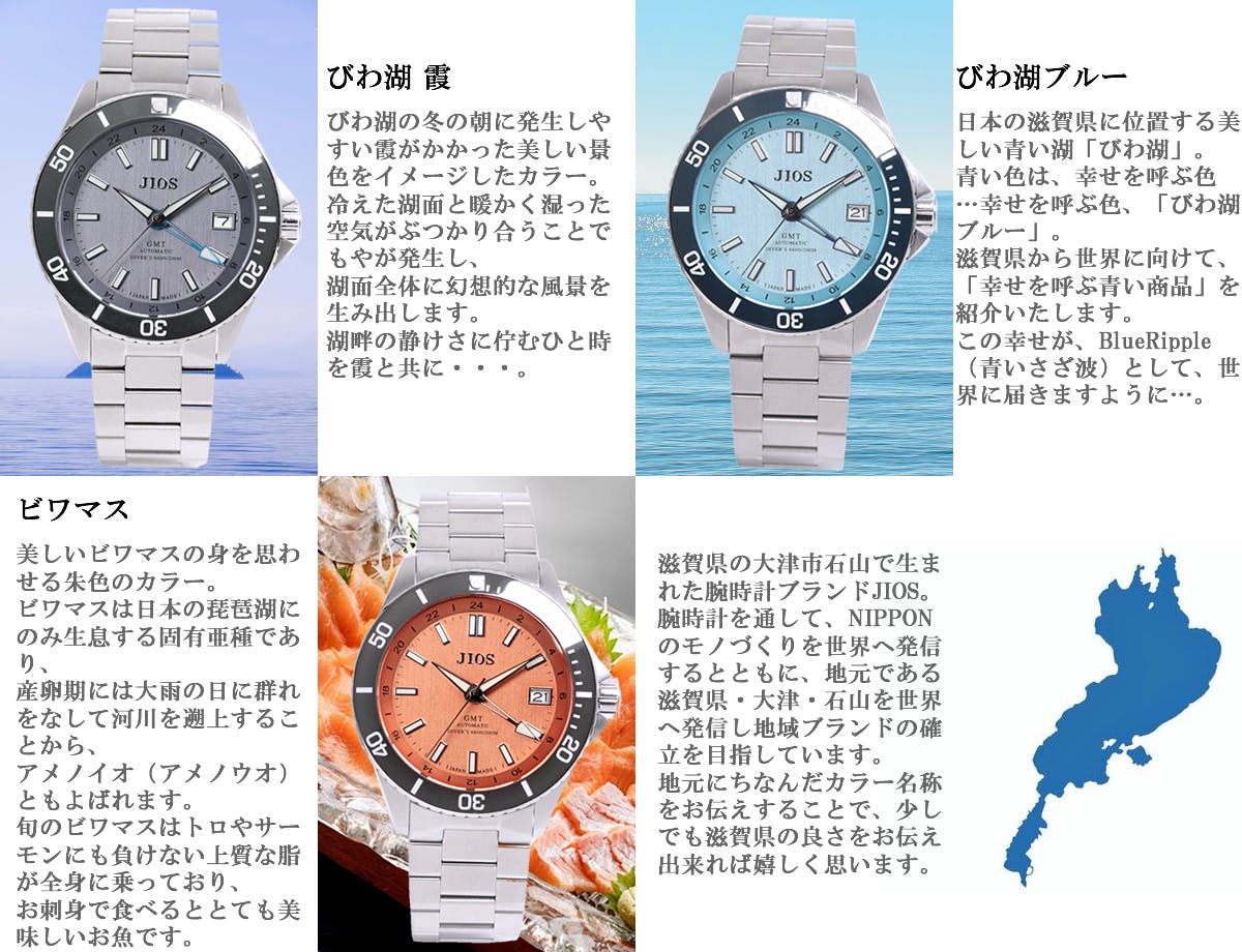 他社モデルから一般的にアイスブルーの名称で流行中のカラー。JIOSでは、世界へびわ湖ブルーを広める活動に賛同し、このプロジェクトへの参画し、腕時計作りから違う角度で地元地域の知名度アップや地域ブランド力向上に少しでも力になれればと思いびわ湖ブルーとしてアイスブルーを売り出したいと考えました。