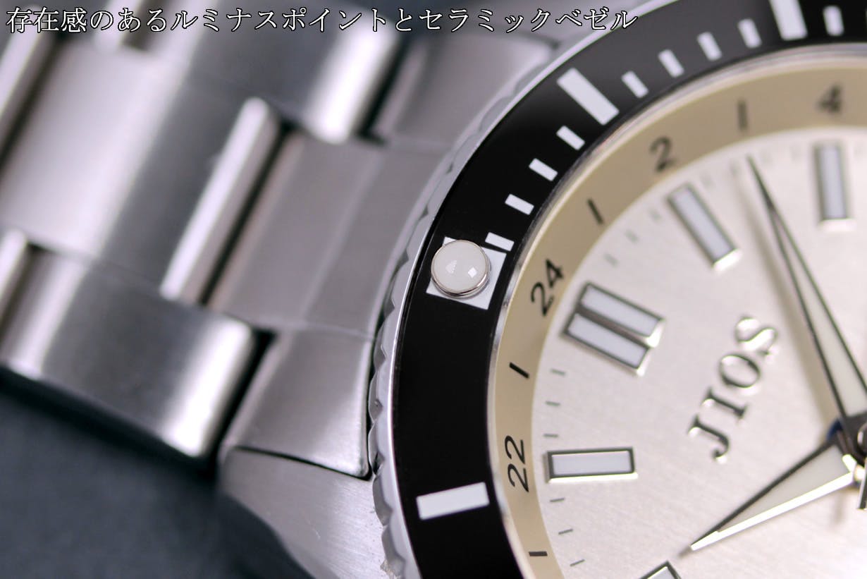 JIOSの2NDモデルでもある「GMTダイバーズ104」はあえて伝統的なダイバーズウォッチにデザインすることで、琵琶湖の深さ104Mをも耐えうる堅牢な防水性(200M防水)を備えるダイバーズウォッチであることを示しています。