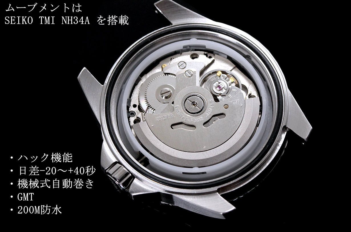 ムーブメント:機械式自動巻き(NH34)、ハック機能付き、日差:-20~+40秒、GMT搭載、ねじ込み式リューズ、サファイアカーブガラス、畜光:スーパールミノヴァ、防水性能:200M防水、スクリューバック、ステンレスベルト、製造国:日本(MADE IN JAPAN)