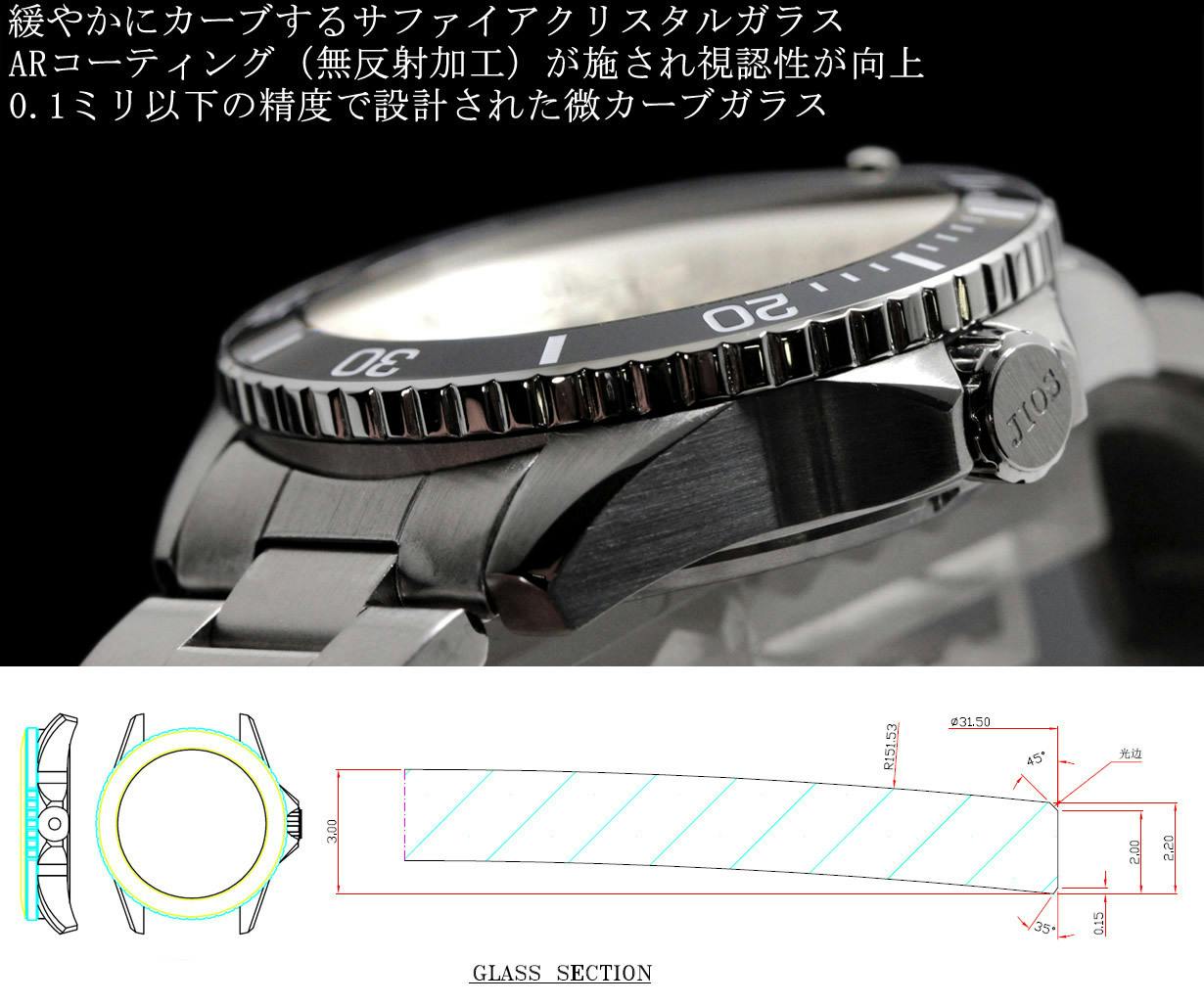 JIOS「GMTダイバーズ104」モデルには、視認性をより向上させるため、光の乱反射を防止するARコーティング(Anti-Reflective coating)が施されています。※ガラスの内側に反射防止膜を蒸着しています。