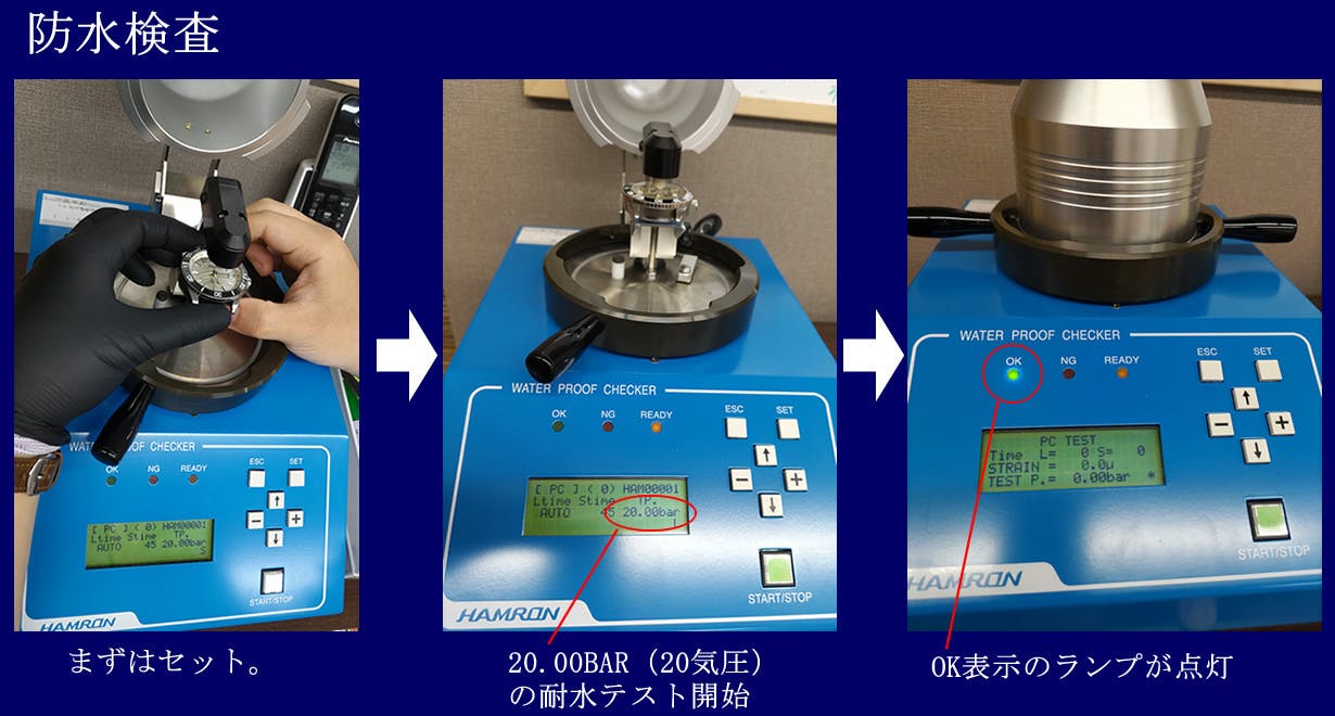通常1度しか行わない防水検査も5度以上繰り返し行い確実に基準をクリアしました。一般的に20気圧(200M)もの防水性・耐水性にするには腕時計の裏蓋はシースルーは出来ないとされています。そのためステンレス蓋となり、刻印が可能なスペースが生まれることになりました!