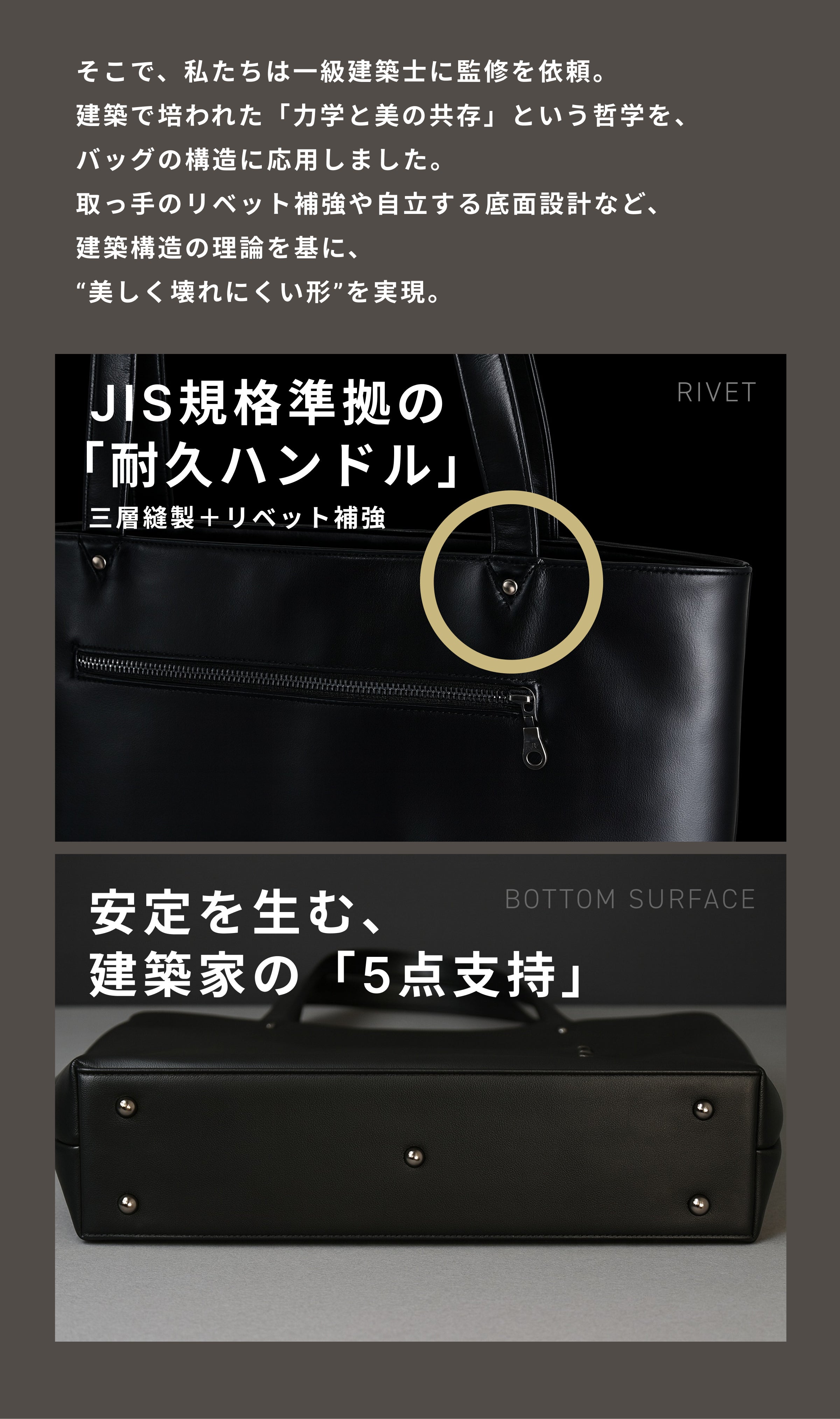 壊れにくい“構造美”を追求したこのトートが、毎日の通勤や出張、そして人生のさまざまな場面で、長く寄り添う相棒になることを願っています。