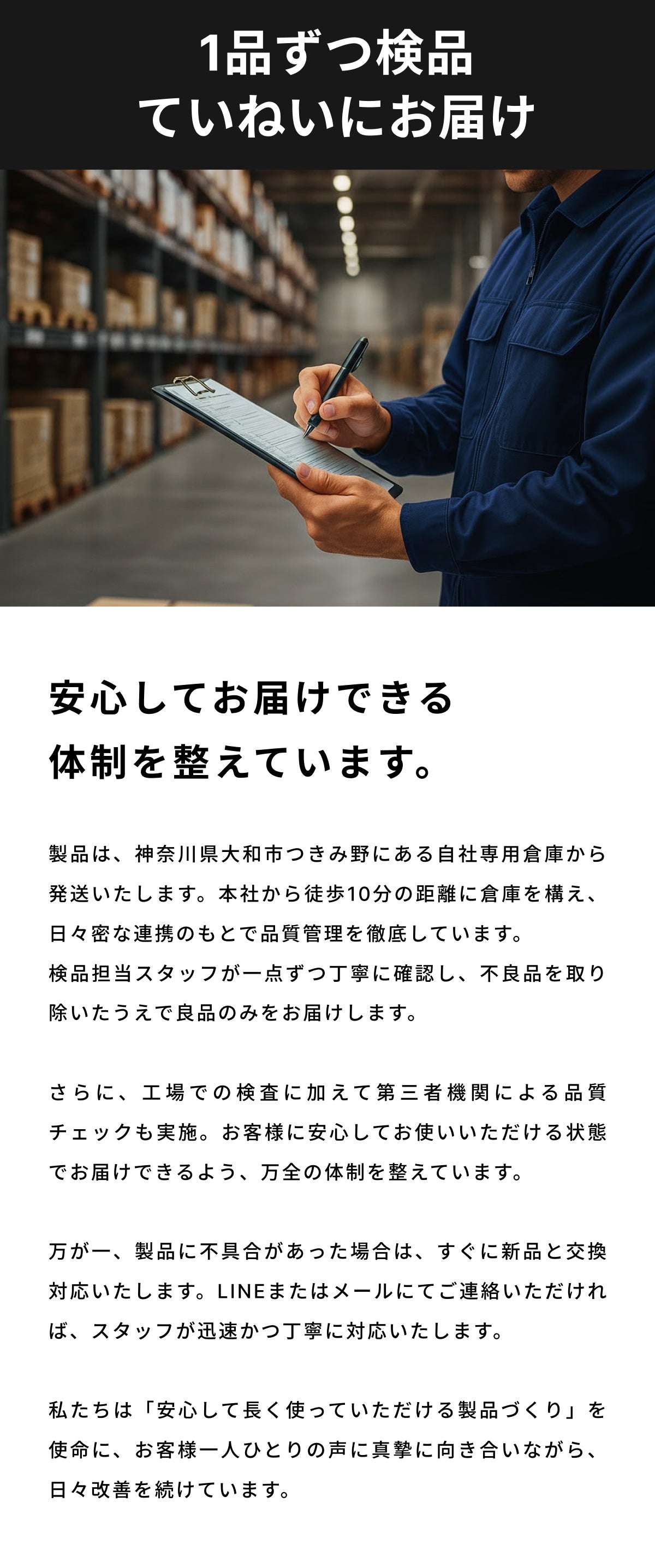 ただし、初期不良・破損など製品不備があった場合は、到着後14日以内にご連絡いただければ迅速に交換対応をいたします。