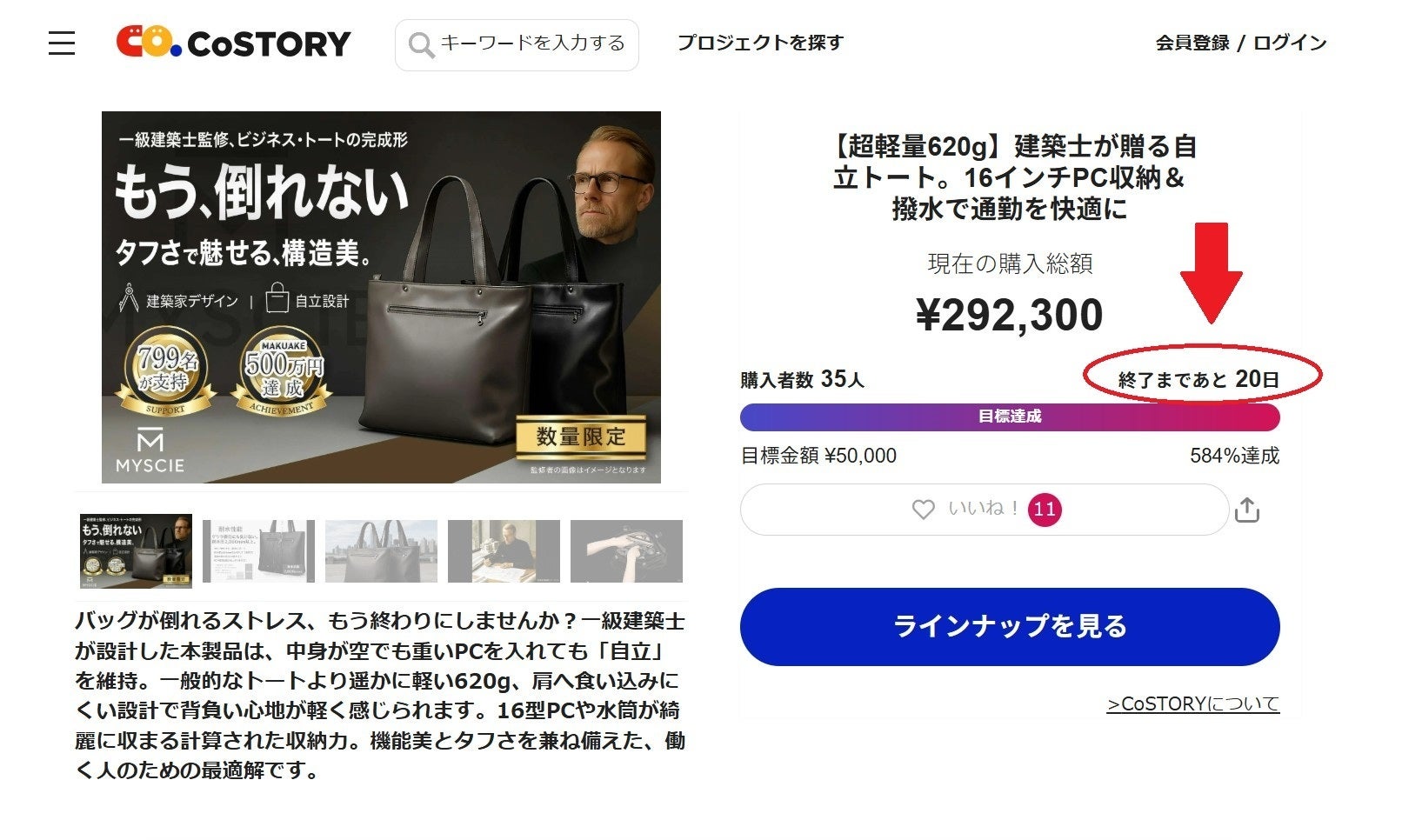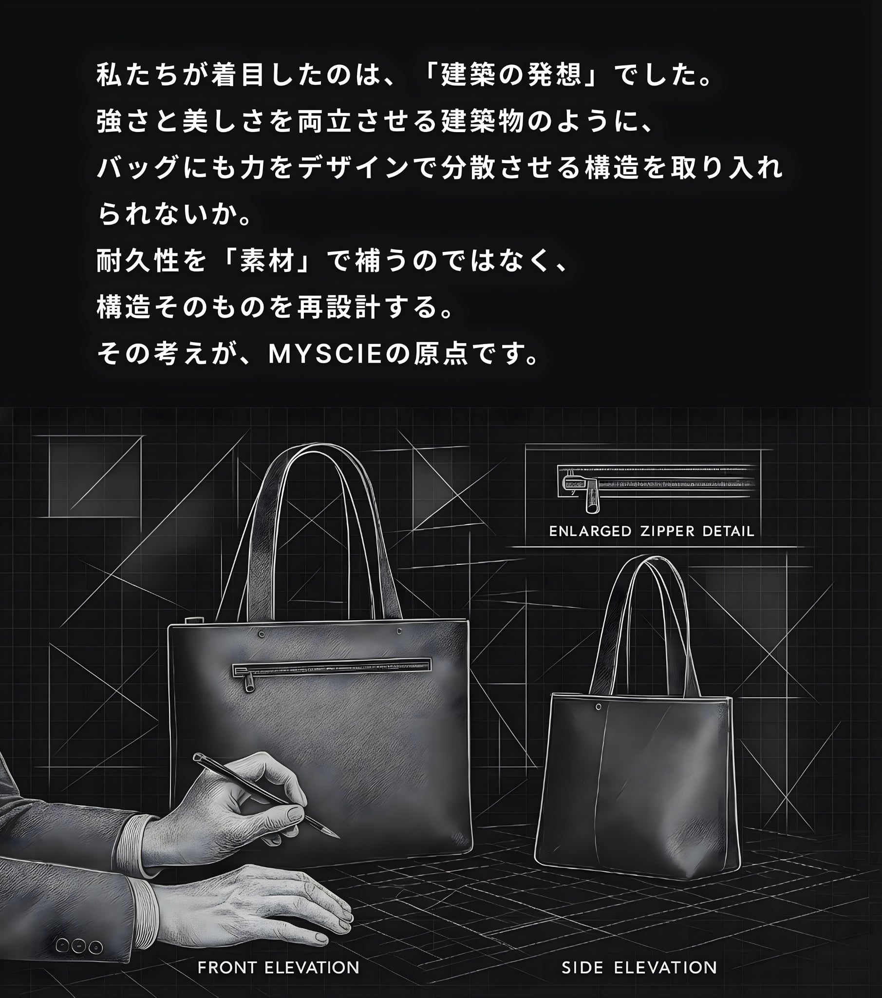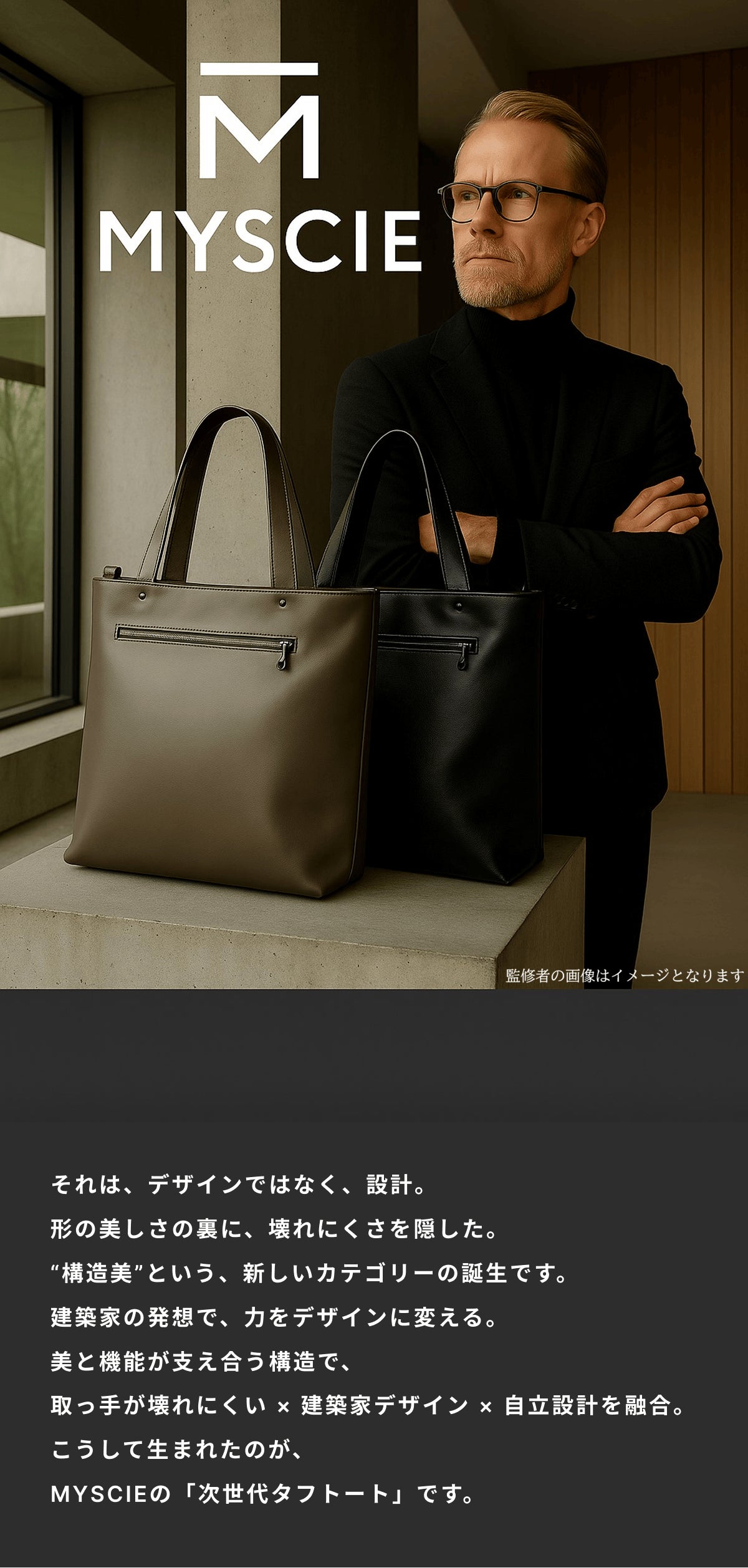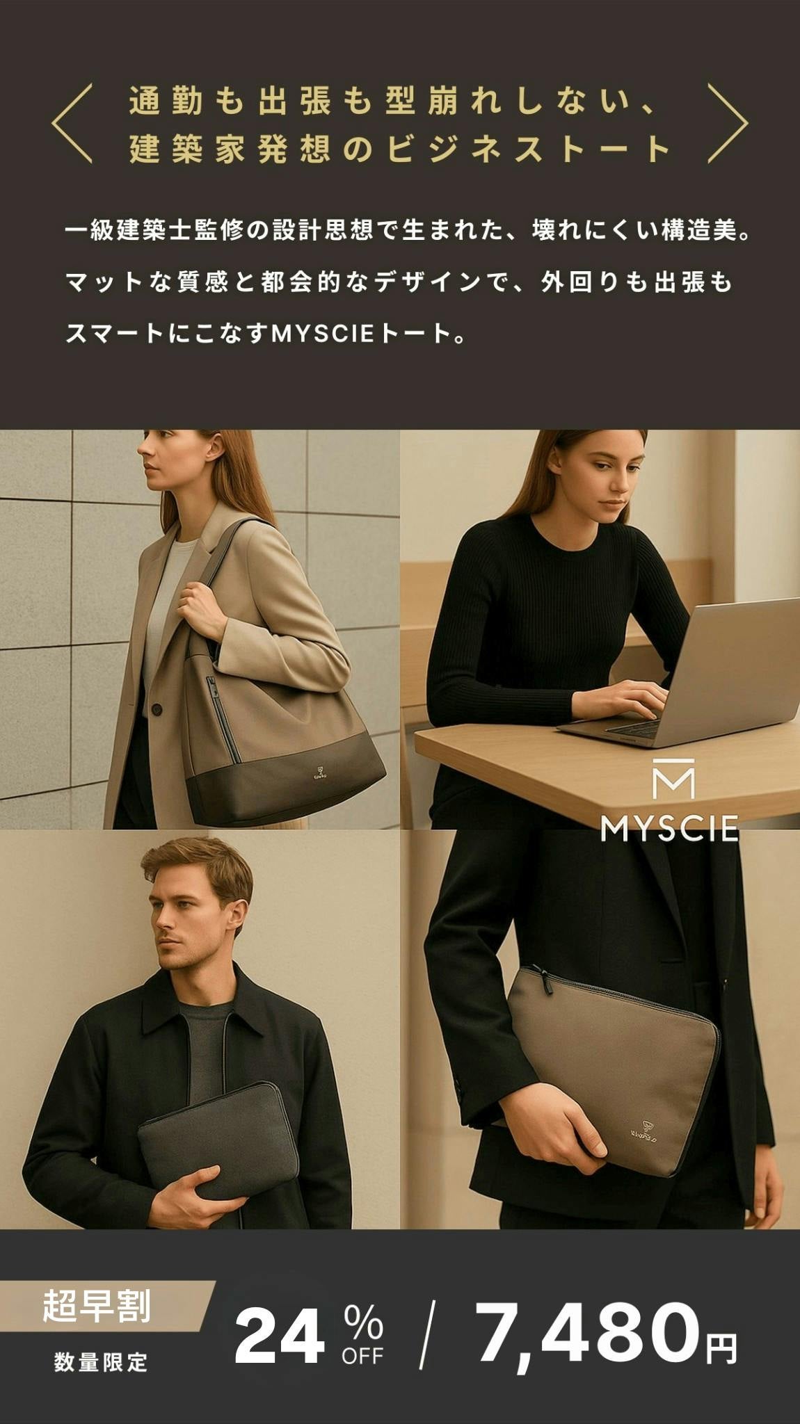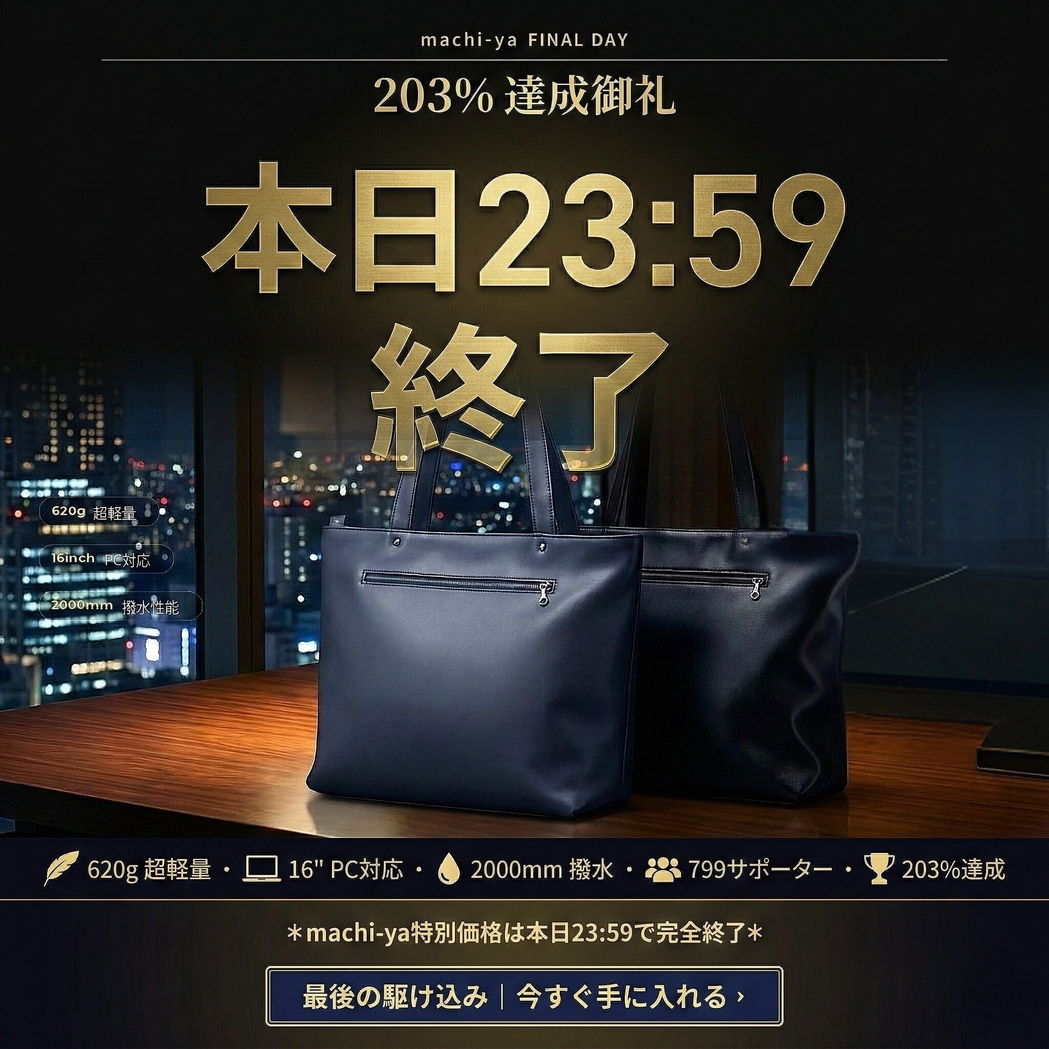 2026/02/24 18:33こんにちは。MYSCIE(ミースオーシー)を企画・運営するオーサムアートボーイ合同会社です。おかげさまで本プロジェクトは 目標達成率203% を突破、81名 の方にご支援いただいております。本当にありがとうございます。本日は、プロジェクト終了まで 残り4日 となりましたので、ぜひお伝えしたいことがあり活動報告を書いています。---■ 超早割ブラック、完売いたしました最もお得な約24%OFFの「超早割」ブラックカラーは、おかげさまで 50個すべて完売 となりました。現在、超早割でお求めいただけるのは ダークグレーのみ(残り21個) です。こちらも同じ7,480円(約24%OFF)でお届けしますので、お悩み中の方はお早めにご検討ください。超早割が終了した後は、machi-ya割(8,480円・約15%OFF)のみのご案内となります。---■ なぜ「MYSCIEの次世代タフトート」が81名に選ばれているのかご支援者の皆さまからいただいた声で最も多いのが、「バッグが壊れるストレスから解放されたい」 というものでしたMYSCIEの次世代タフトートは、一級建築士が「鞄を構造物として設計する」という発想から生まれました。* 超軽量620g:一般的なビジネストートの約半分の重さ* 自立構造:中身が空でも、重いPCを入れても倒れない* 16インチPC対応:MacBook Pro 16インチがすっぽり収まる設計* 撥水加工:突然の雨でも中身を守るこれは「軽いけど頼りない」でも「丈夫だけど重い」でもない、建築の知見で両立させた第三の選択肢 です。---■ 前回Makuake実績:達成率548%・支援者798名・500万円突破実は、MYSCIEブランドのバッグは今回が初めてではありません。前回Makuakeで実施したプロジェクトでは 達成率548%、798名の方にご支援 いただきました。その経験をもとに改良を重ね、今回machi-yaにて新たにお届けするのが本プロジェクトです。品質には自信を持ってお届けします。---■ 残り4日。迷っている方へプロジェクトは 2月28日 に終了いたします。終了後の追加募集は現時点で予定しておりません。* 超早割ダークグレー(7,480円):残り21個 → 最もお得にお求めいただけるラストチャンスです* machi-ya割(8,480円):ブラック・ダークグレーともにまだ在庫がございますすべてのリターンに machi-ya限定のトートバッグ保存袋 が付属します。プロジェクト終了後10日以内の発送予定ですので、届くまでお待たせしません。▼ ご支援はこちらから[https://camp-fire.jp/projects/920789/view](https://camp-fire.jp/projects/920789/view)最後まで一人でも多くの方にMYSCIEの使い心地をお届けできるよう、チーム一同全力で取り組んでまいります。引き続き、応援よろしくお願いいたします。MYSCIE / オーサムアートボーイ合同会社--- もっと見る