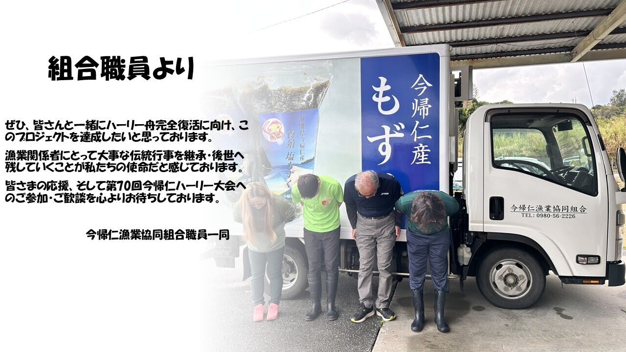 この先も伝統を守り、航海の安全や豊漁の祈願を行っていく、また、行事を行い、後世へ伝統文化を残していく責任を私たち今帰仁漁業協同組合は感じ、クラウドファンディングを決意しました。