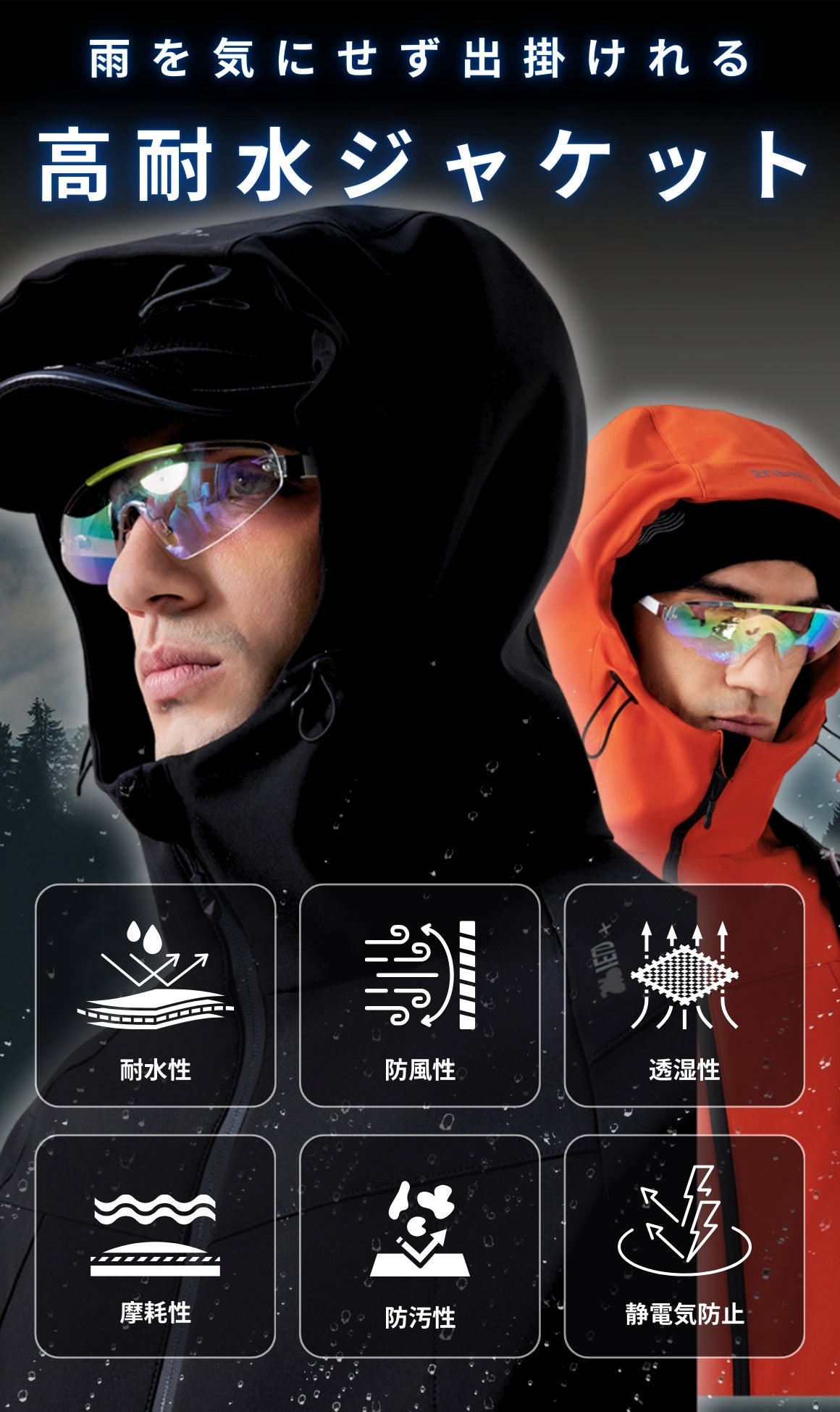 大雨でもしっかり防ぐハイレベルな耐水仕様。レインウェア並みの耐水力で、天候を気にせず行動できます。