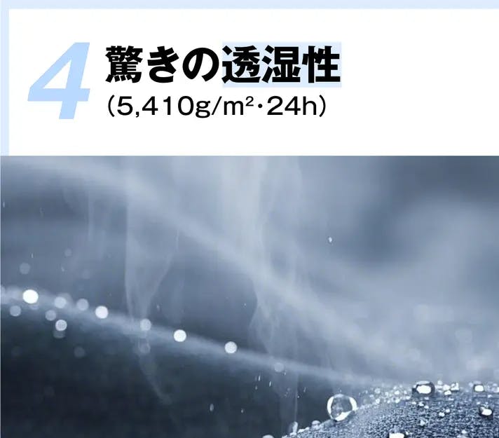 大人の安静時で1時間あたり約50g、軽い運動で1時間あたり約500g、ランニングなどの激しい運動で1時間あたり約1,000gと、安静時であっても発汗しています。快適な着心地のためには、耐水性だけでなく、透湿性の高さも重要です。
