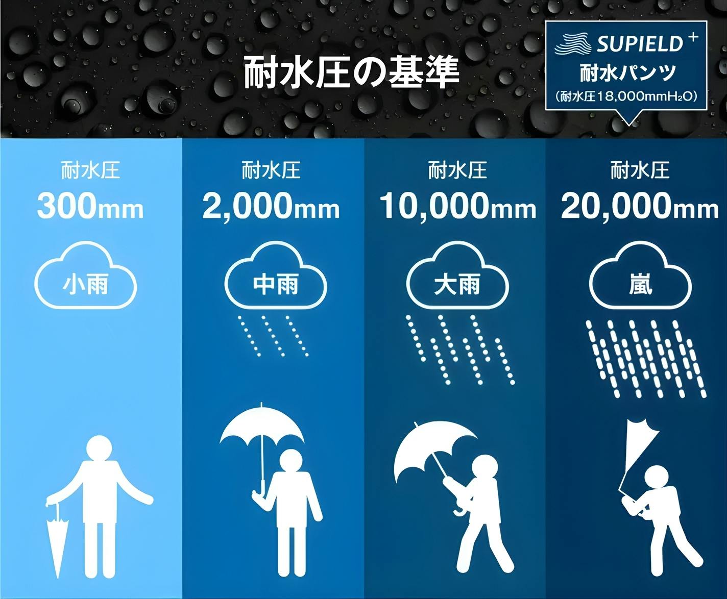 耐水圧とは、生地に染み込もうとする水の力を抑える性能の数値のことです。耐水圧の基準は下記が目安となります。