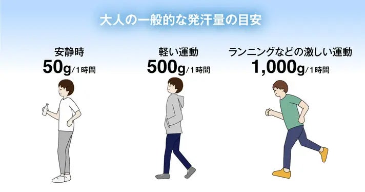 大人の安静時で1時間あたり約50g、軽い運動で1時間あたり約500g、ランニングなどの激しい運動で1時間あたり約1,000gと、安静時であっても発汗しています。快適な着心地のためには、耐水性だけでなく、透湿性の高さも重要です。