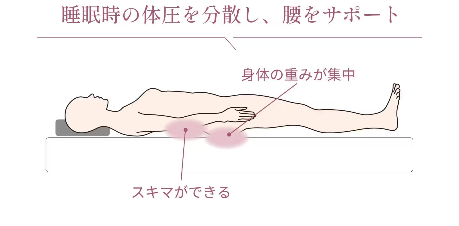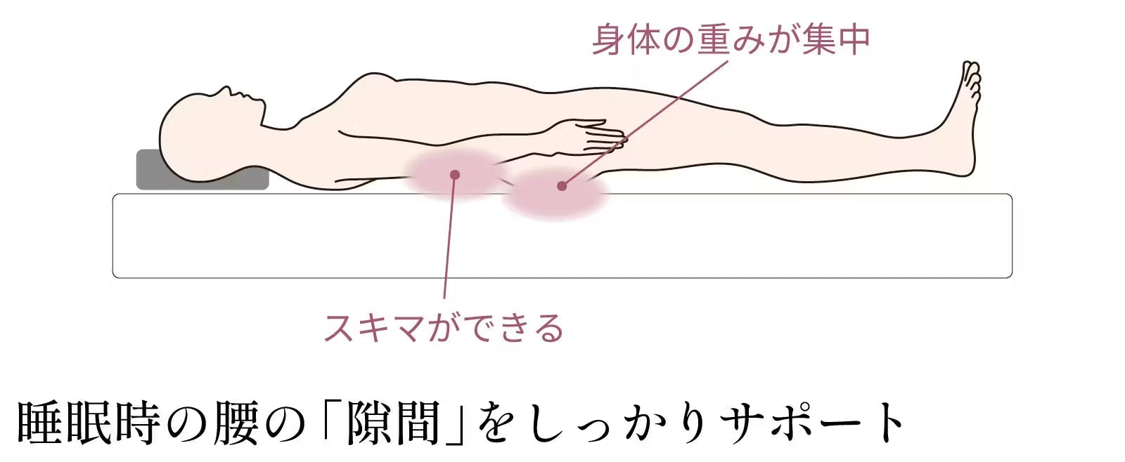 背骨がちょうど「腰」の位置で湾曲しているため、人はあおむけに寝ると「腰」の部分が浮いた状態になります。