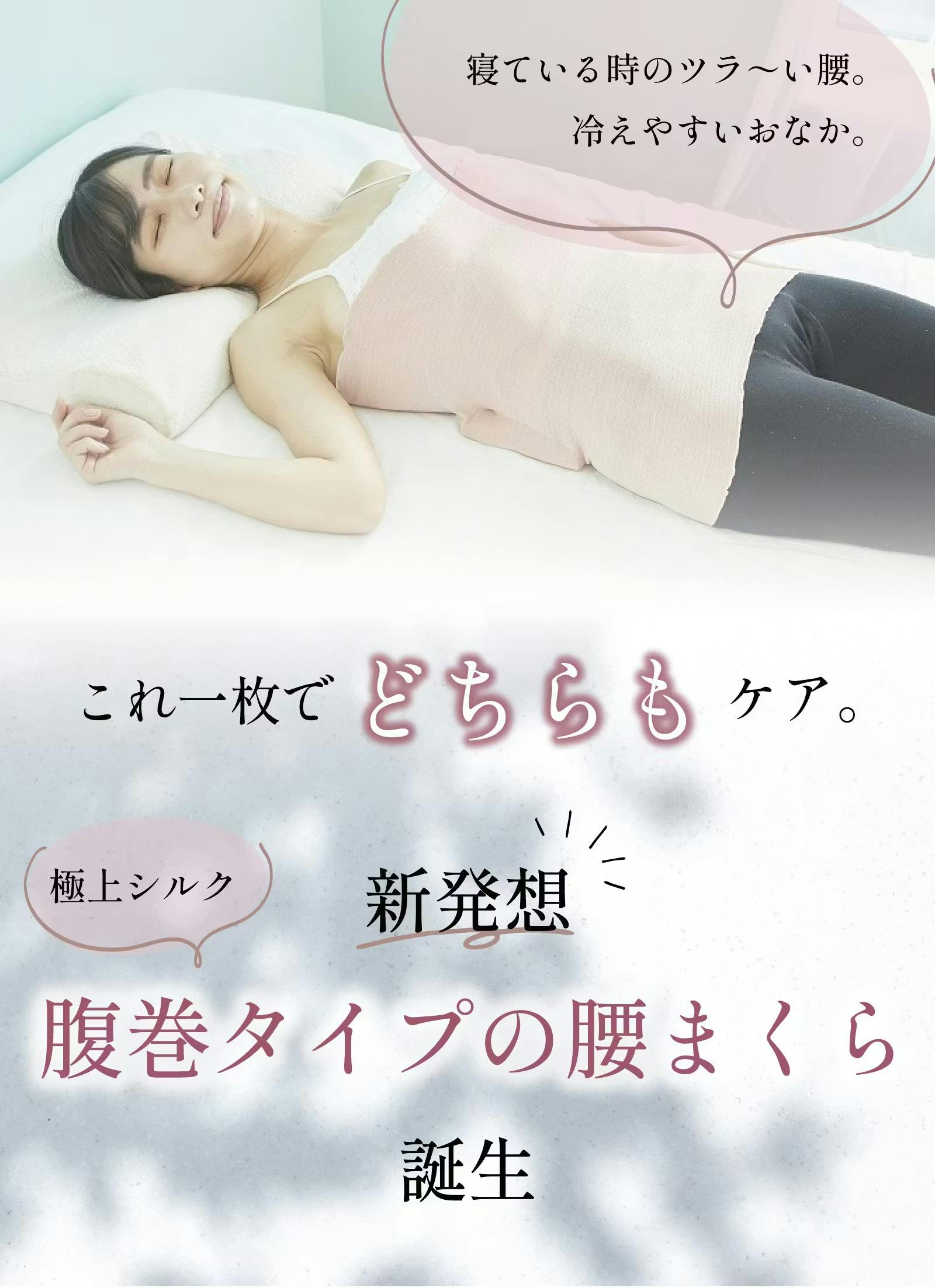 睡眠時はしっかり腰をサポートする「腰まくら」として。普段は高品質な極上シルクの「腹巻き」として、お使いいただけます。