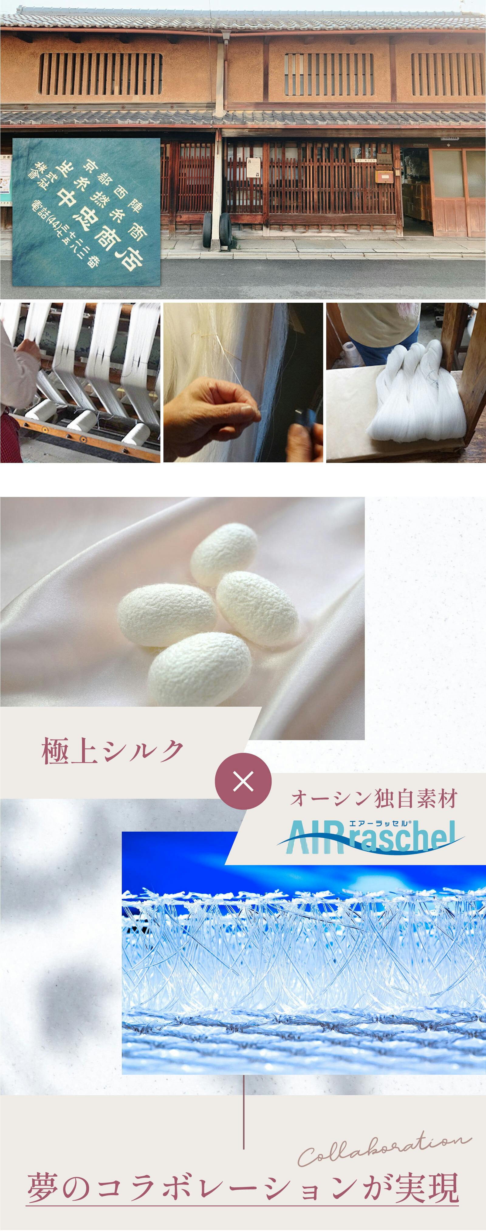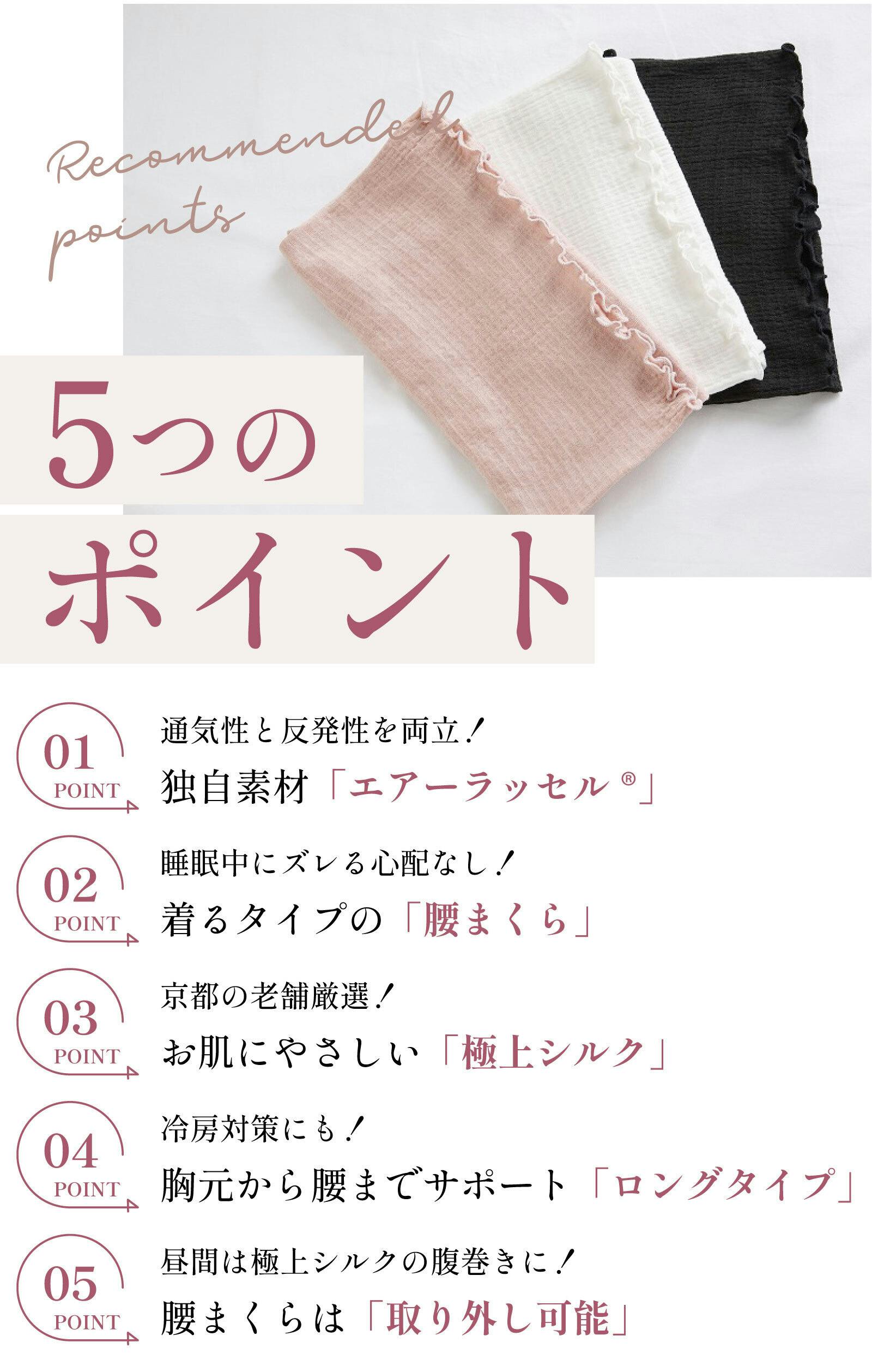 高反発性・通気性・耐久性に優れた「腰まくら」としての機能性に加え、「呼吸する繊維」とも呼ばれるシルクならではの滑らかな肌触りを誇る「素材感」、そして、胸元から腰までを包み込むロングタイプとしたことでの、通年を通しての「使い勝手」。