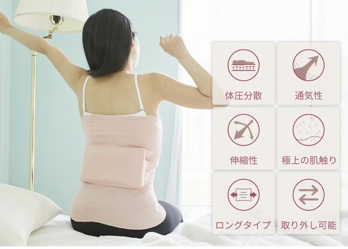 高反発性・通気性・耐久性に優れた「腰まくら」としての機能性に加え、「呼吸する繊維」とも呼ばれるシルクならではの滑らかな肌触りを誇る「素材感」、そして、胸元から腰までを包み込むロングタイプとしたことでの、通年を通しての「使い勝手」。