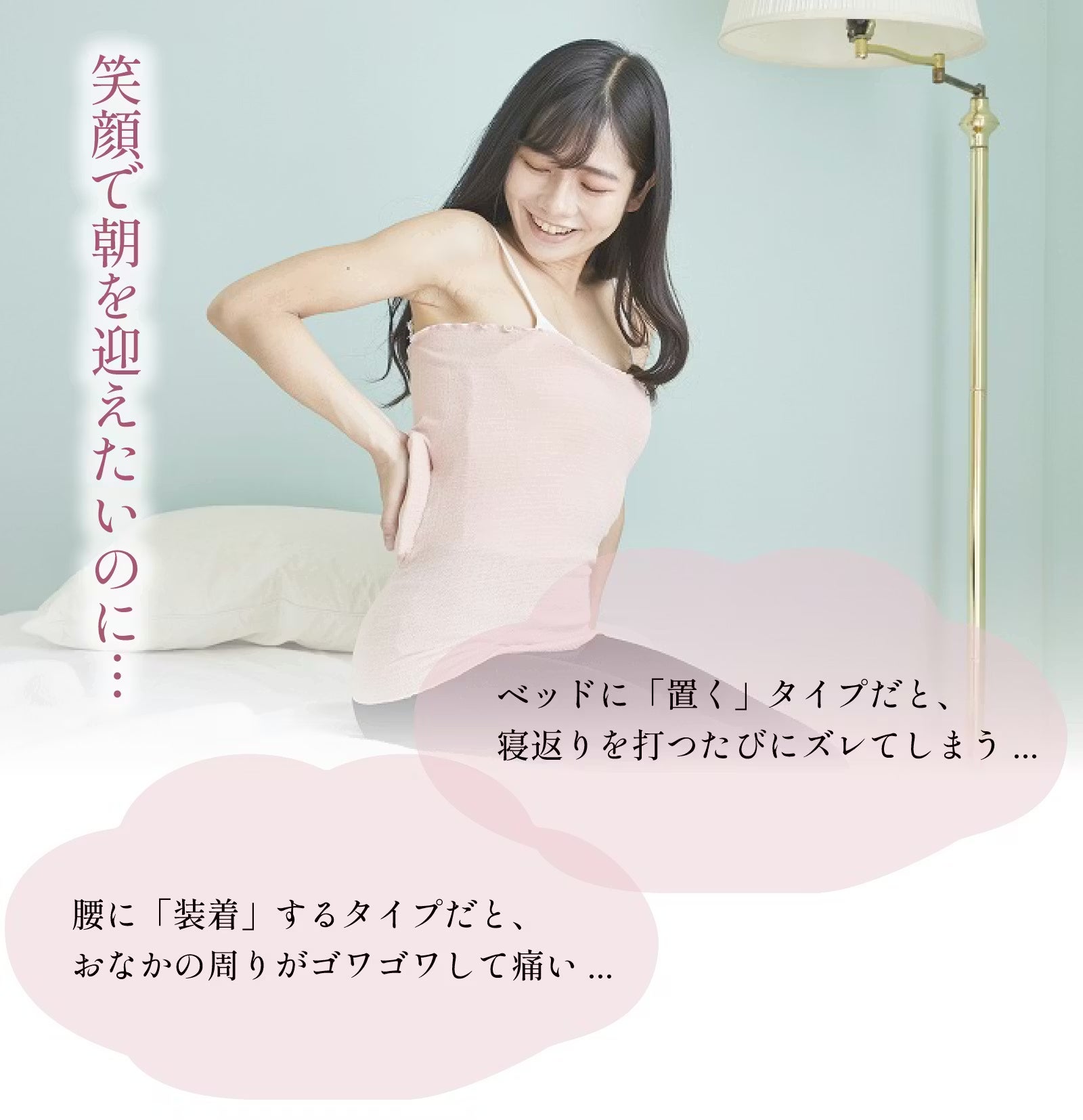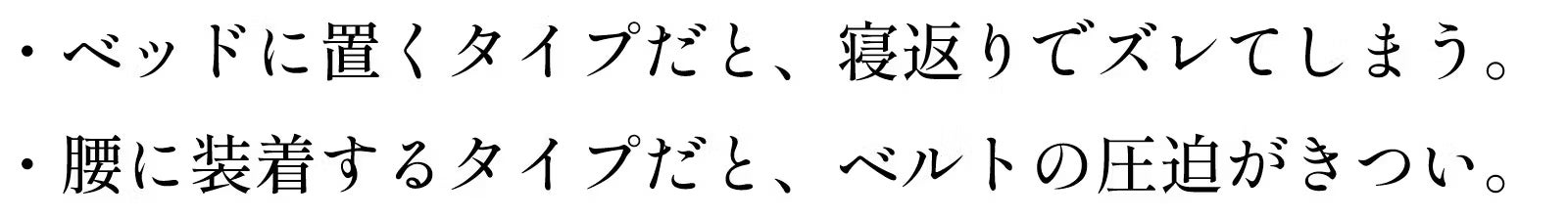 枕やマットレスといった寝具を製造・販売をしている現場から、こんなお悩みの声を多く聞いたことが、「腹巻き腰まくら」を開発するきっかけでした。ズレずに体にフィットさせるには、やはり「装着」できなければならない。しかし、締め付けや凹凸があっては睡眠の妨げになってしまう...