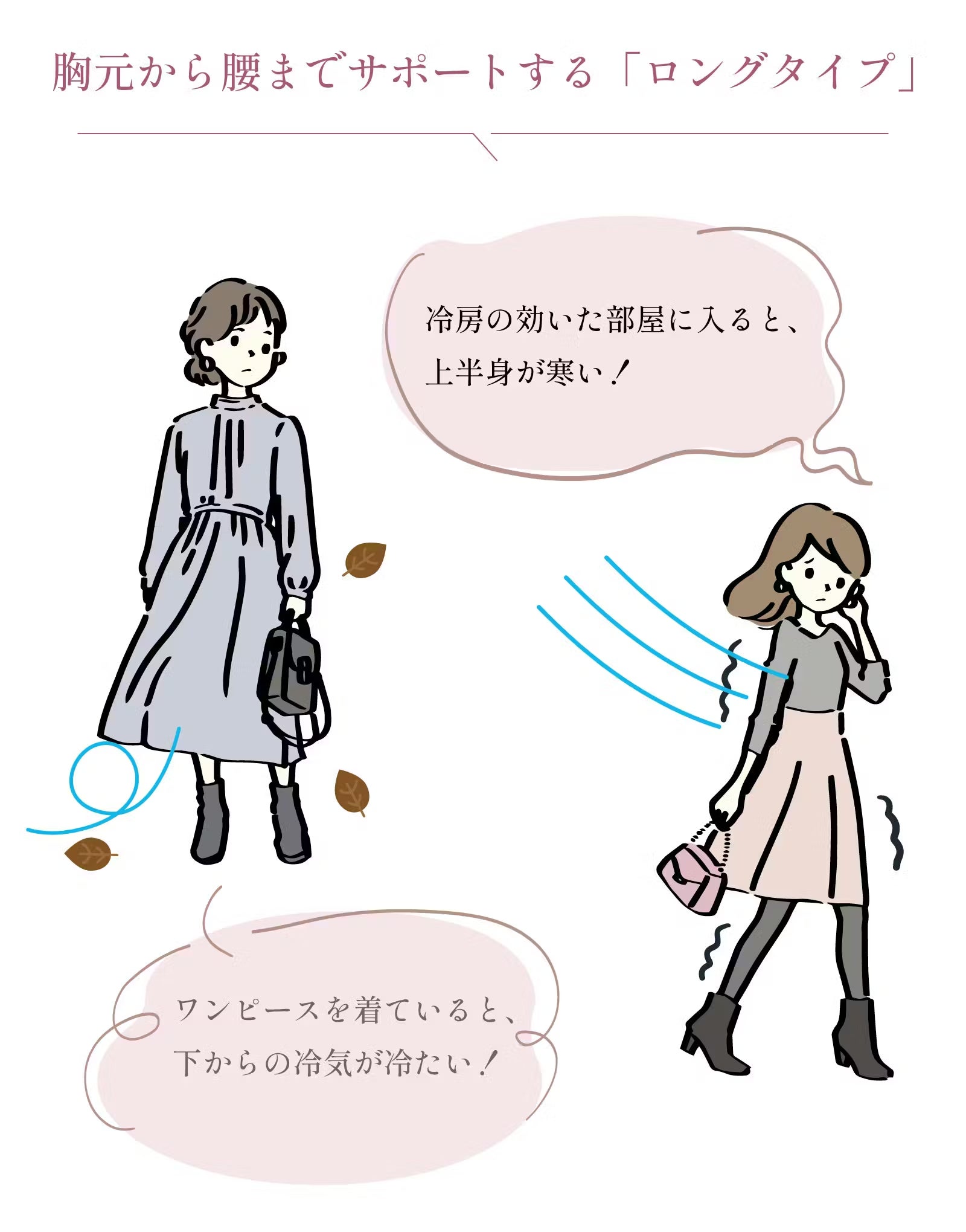 そこで「腹巻き腰まくら」では、胸元から腰までをしっかり包み込める「ロングタイプ」にしました。