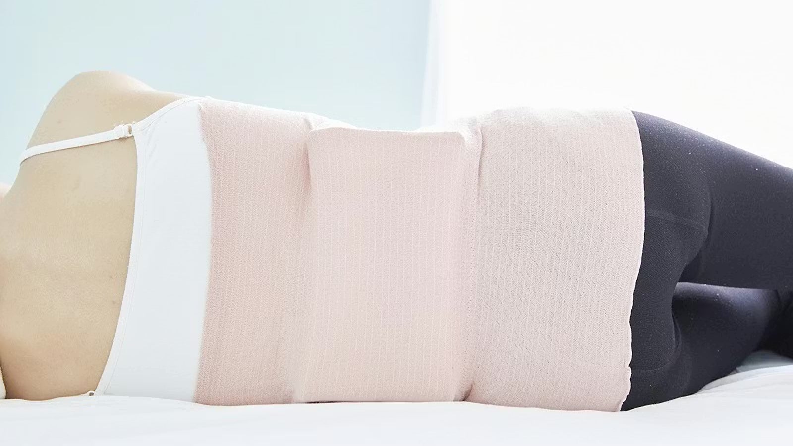 着るタイプの「腹巻き腰まくら」なら、腹巻きのような優しいフィット感を保ちつつ、寝返りを打ってもズレにくい。