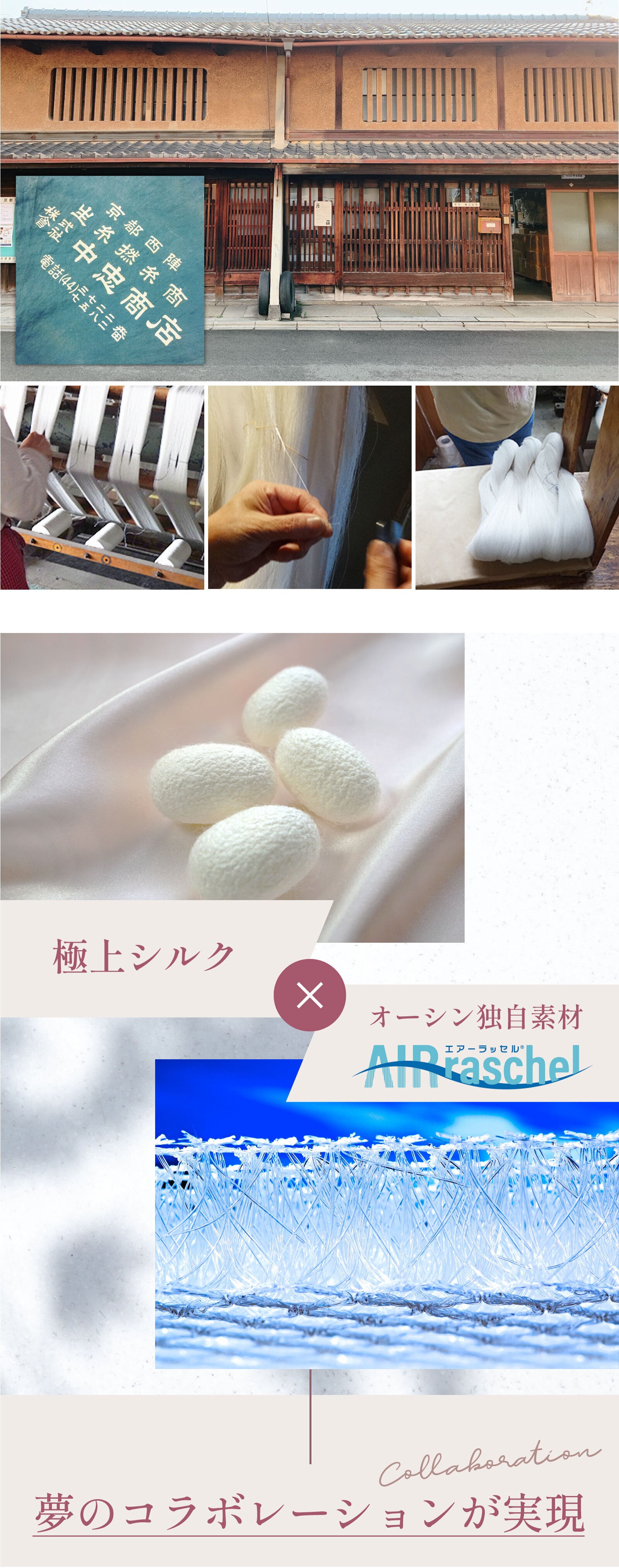 京都西陣の老舗「中忠商店」の全面協力をいただき、腹巻き部分には厳選した極上シルクを採用。