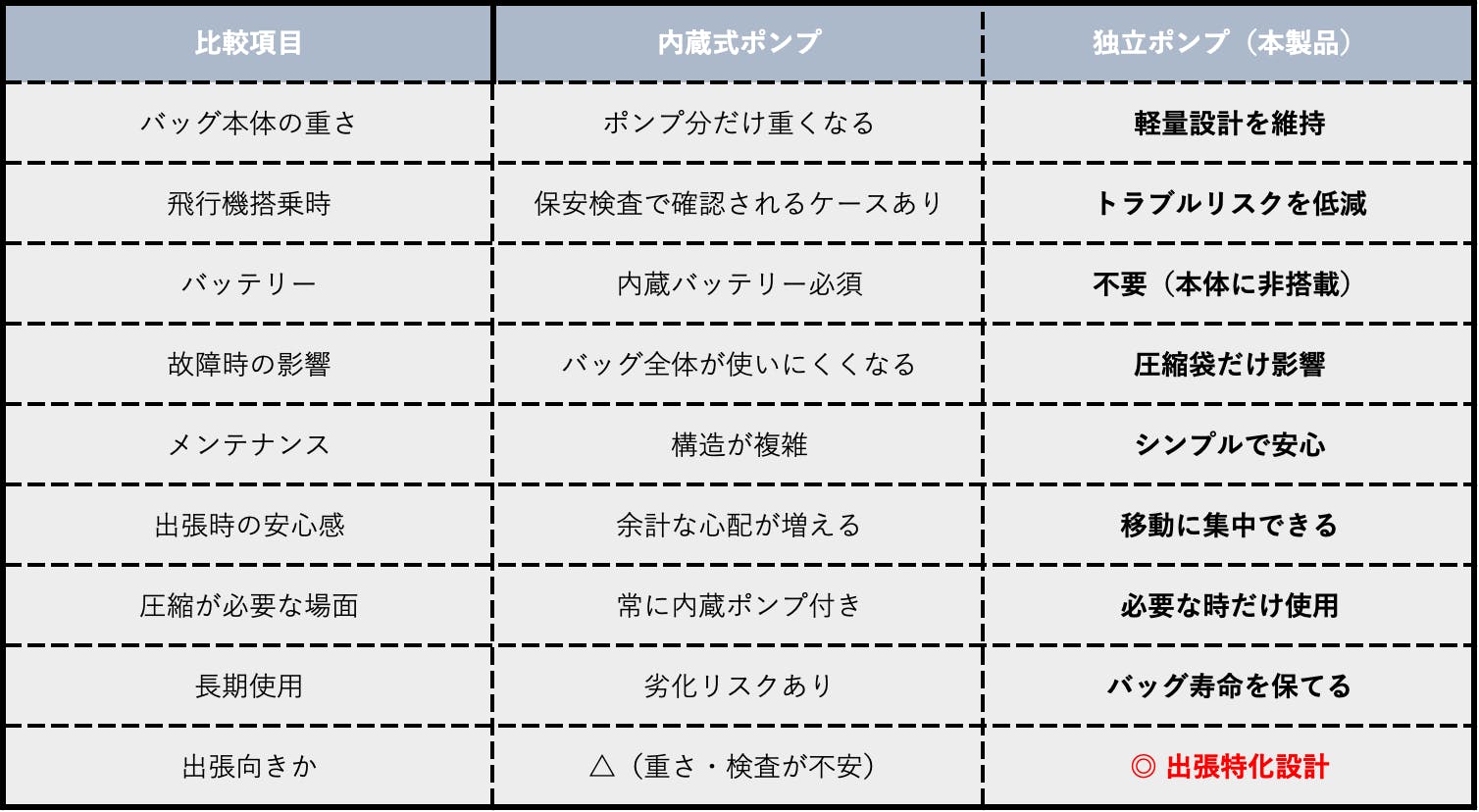 そこで私たちが提案するのは、バッグ本体にはポンプを内蔵しない設計です。