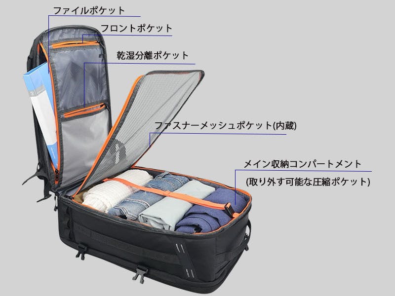 その答えが、セパレート式圧縮袋を備えた、出張特化ビジネスリュックです。