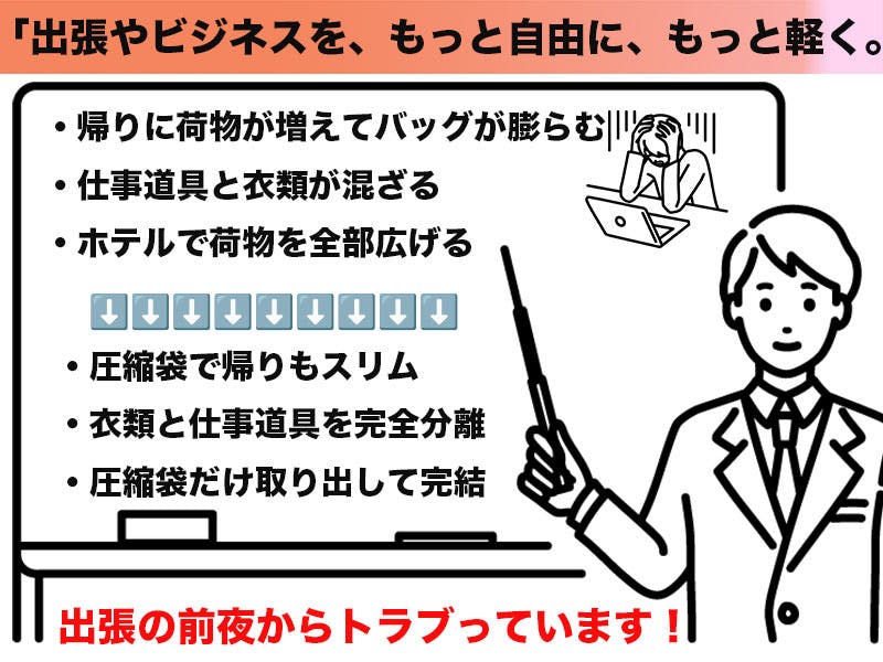 【挑戦日々のご報告】出張のストレスを減らす、分離式圧縮収納バッグ!