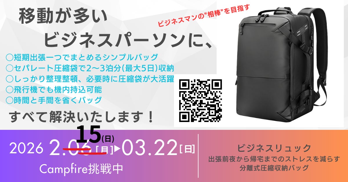 こんにちは。プロジェクトオーナーのOutdoor1です。プロジェクトをご覧いただき、本当にありがとうございます。クラウドファンディングも残り3日となりました。まだ目標には届いていません。ですが、おかげさまで、あと少しで届くところまで来ています。今回のバッグは、出張時の「荷物ストレス」を減らしたいという思いでチャレンジした原点となっています。たくさん機能性をキープしながら、圧縮収納 × セパレート設計(圧縮袋)で、荷物整理をしやすくした出張特化のビジネスリュックです。ここまで来たからこそ、最後までやり切りたいと思っています。実はあと2名で今回の目標を達成します。もし少しでも共感いただけましたら、応援していただけると本当に嬉しいです。どうか力を貸していただけないでしょうか。▼プロジェクトはこちらhttps://camp-fire.jp/projects/920829日常ビジネス、そして少しでも楽な出張にお手伝いできれば、幸いです。よろしくお願い致します。