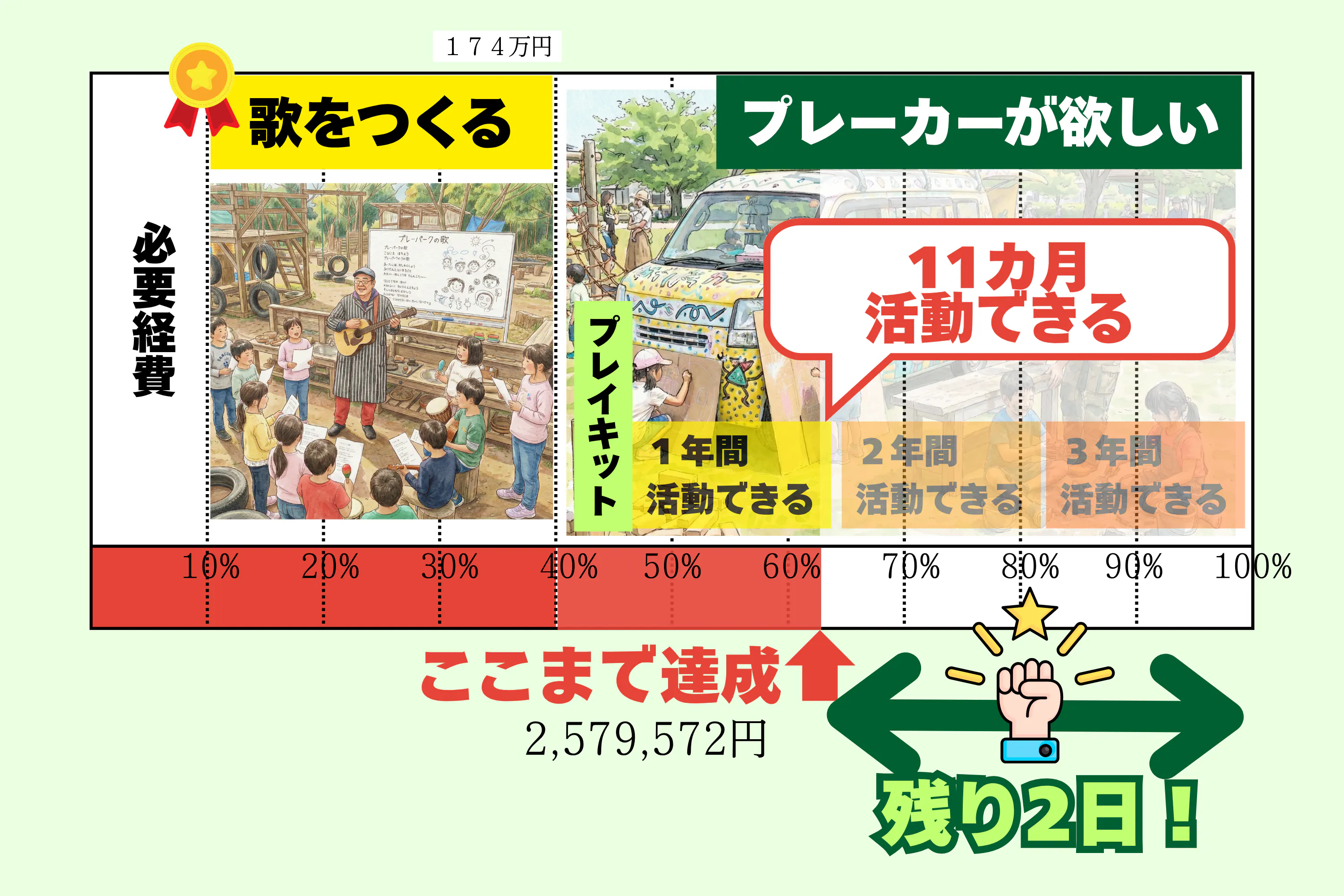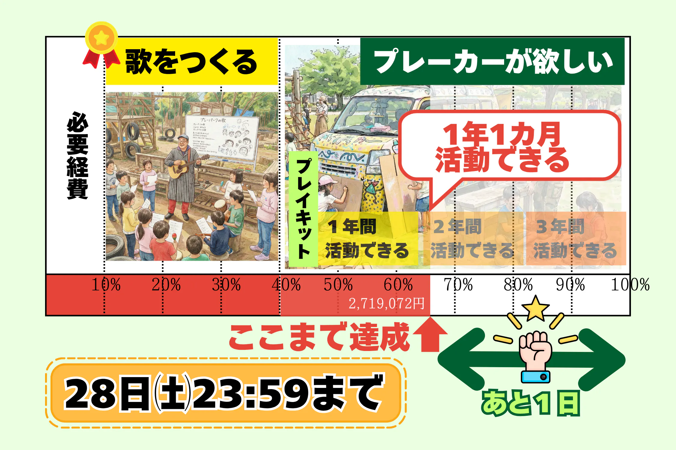 今回、私たちは大きな挑戦をします!子どもたちの想いを乗せた「テーマソング」を作り、そして県内どこへでも遊び場を届けられる「プレーカー」を走らせることで、福岡のすべての子どもたちが自由に遊べる環境を実現したいと考えています。