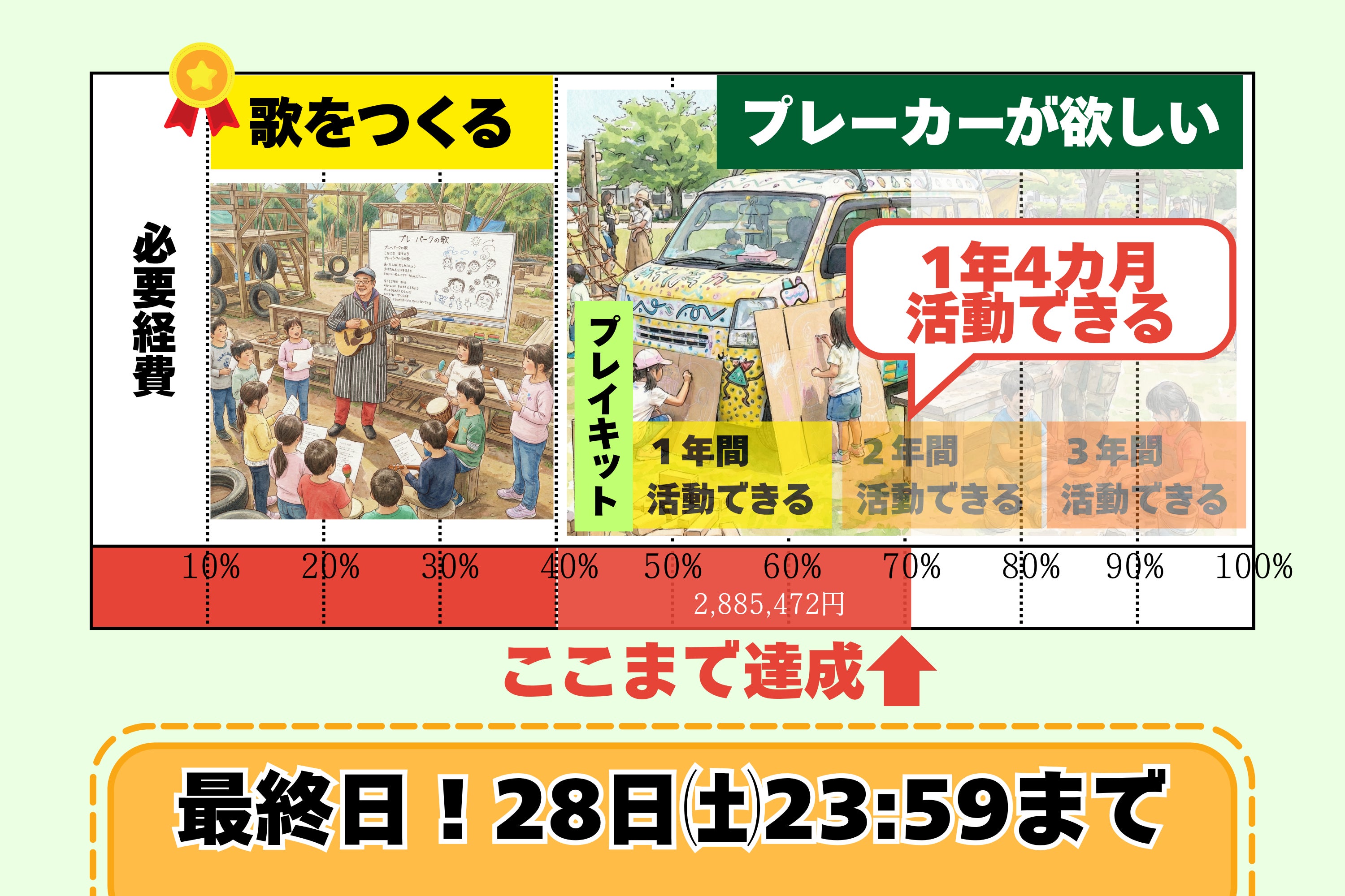 達成率78%超!支援総額3,233,167円224人もの多くの方からご支援をいただきました!本当に、本当に、ありがとうございます!目標金額には未達ですが、個人からのご支援が8割以上を占めており、一人一人の想いが集まり、ここまでの金額が集まったことは快挙だと感じております。重ねて心より御礼申し上げます。不足金額につきましては、クラファン以外の方法で何とか調達できるよう、活動しながら模索したいと思います。明日から2日間、歌づくり合宿へ!クラファンが終わったばかりですが、早速、明日30日㈪と31日㈫の2日間、福岡県内の子どもたち30人と、シンガーソングライターの野田かつひこさんで、プレーパークのテーマソングを作るため「歌づくり合宿」を行います!子どもたちからどんな言葉が生まれ、野田さんがどんな想いとメロディーを引き出すのか、私たちもワクワクしています♪歌が作られていく過程も含め、どうぞお楽しみに!